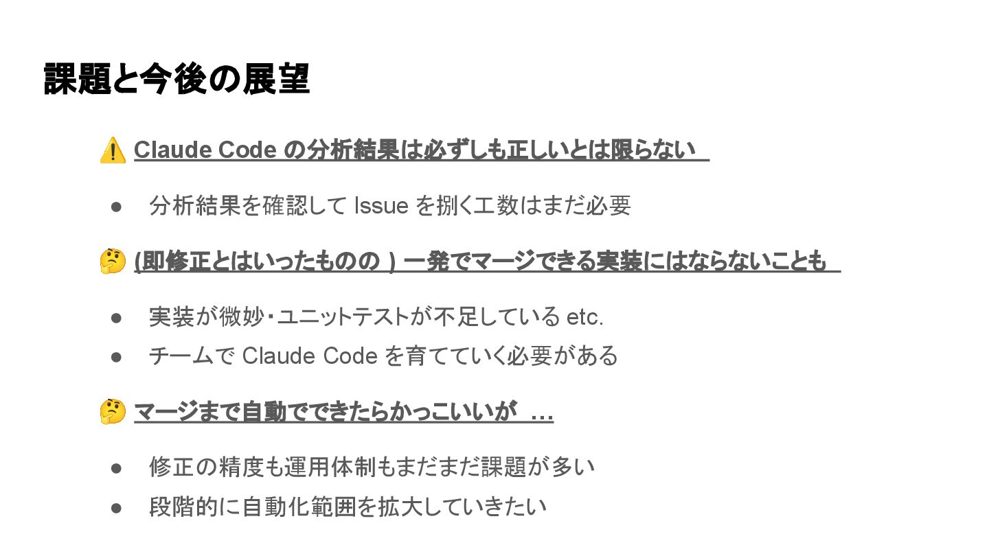 課題と今後の展望 ⚠ Claude Code の分析結果は必ずしも正しいとは限らない • 分析結果を確認して Issue を捌く工数はまだ必要 🤔
