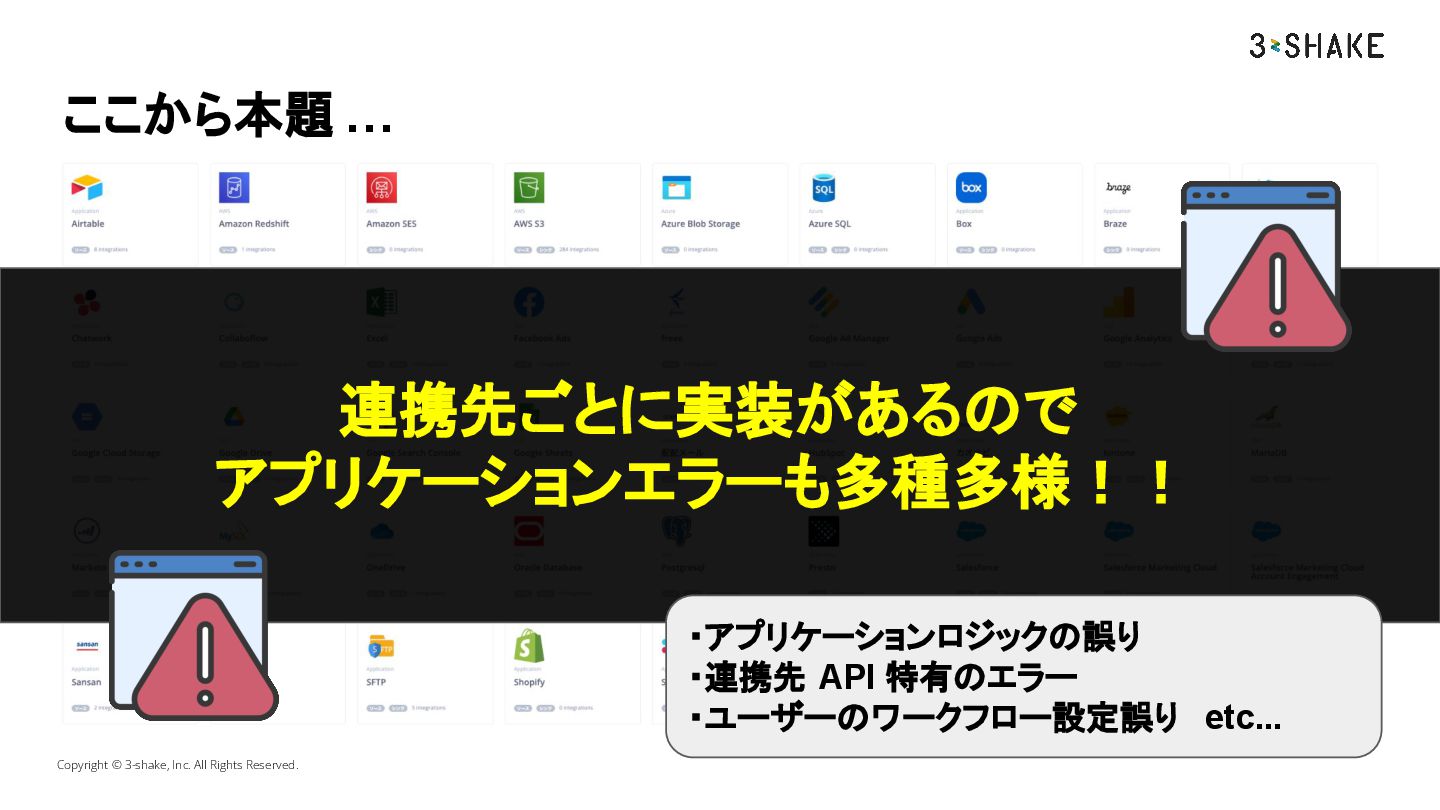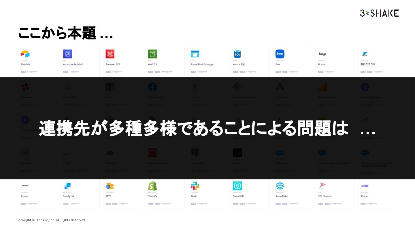 ここから本題 … Copyright © 3-shake, Inc. All Rights Reserved. 連携先が多種多様であることによる問題は