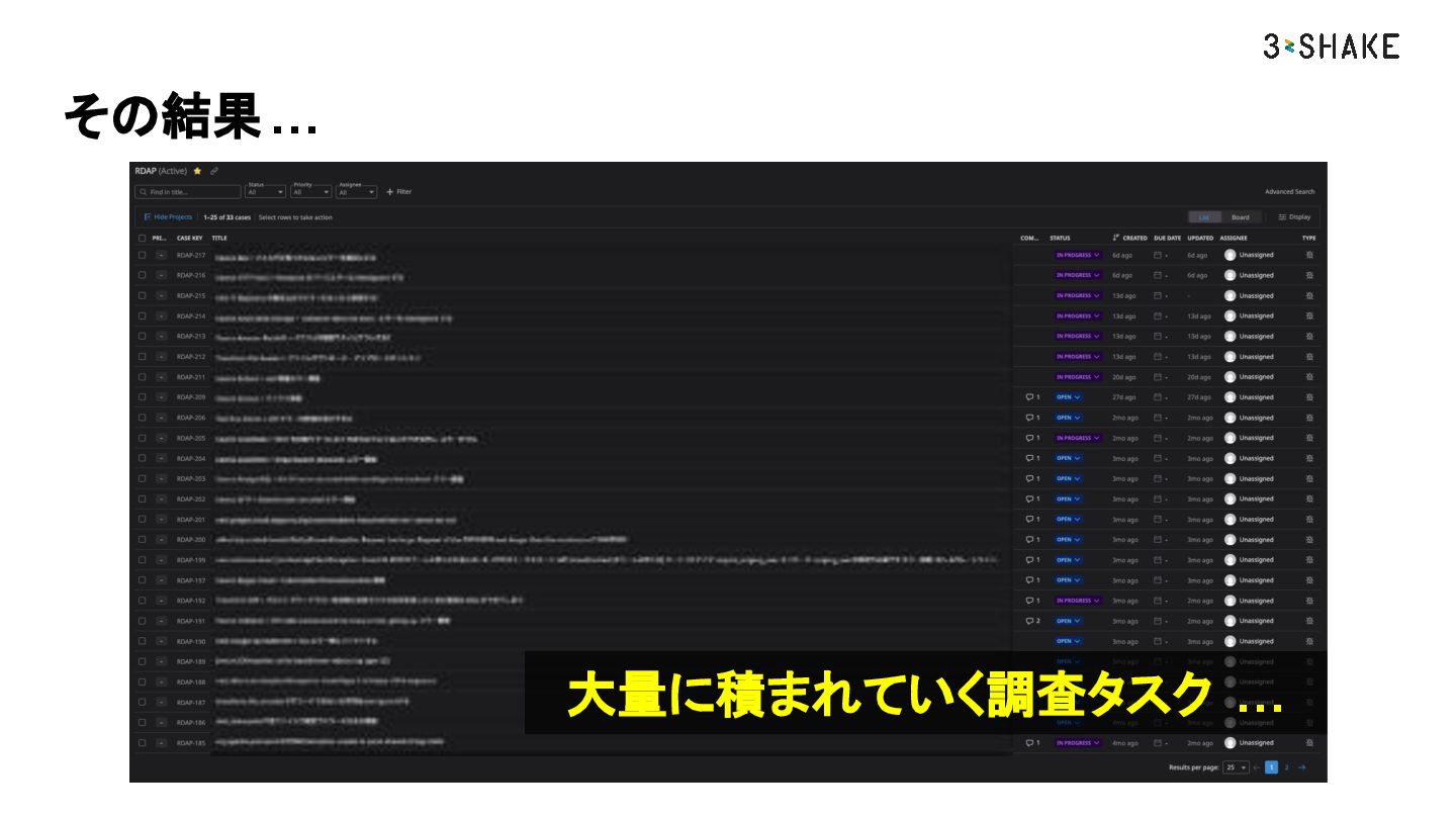 大量に積まれていく調査タスク … その結果…