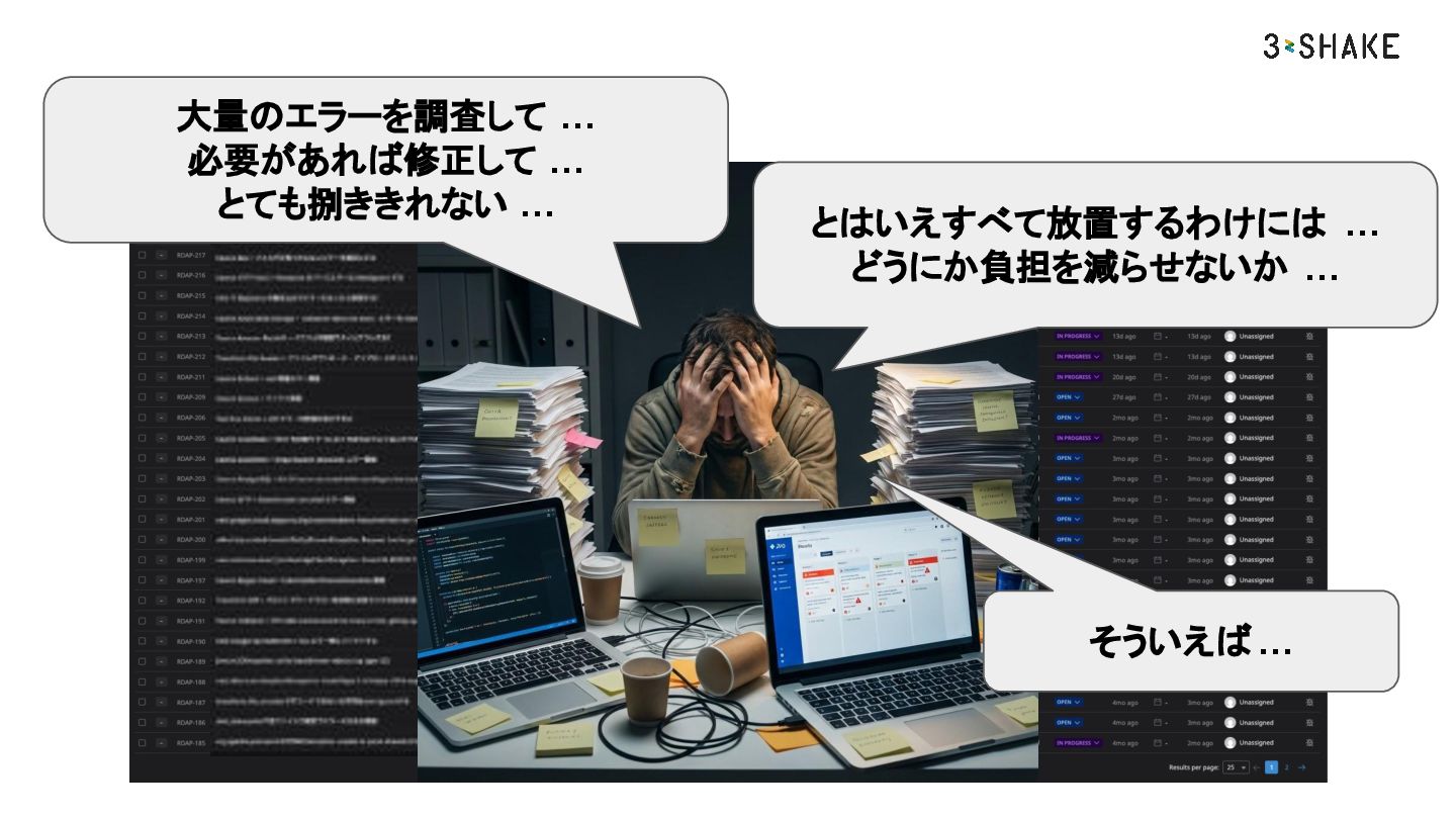 大量のエラーを調査して … 必要があれば修正して … とても捌ききれない … とはいえすべて放置するわけには … どうにか負担を減らせないか …