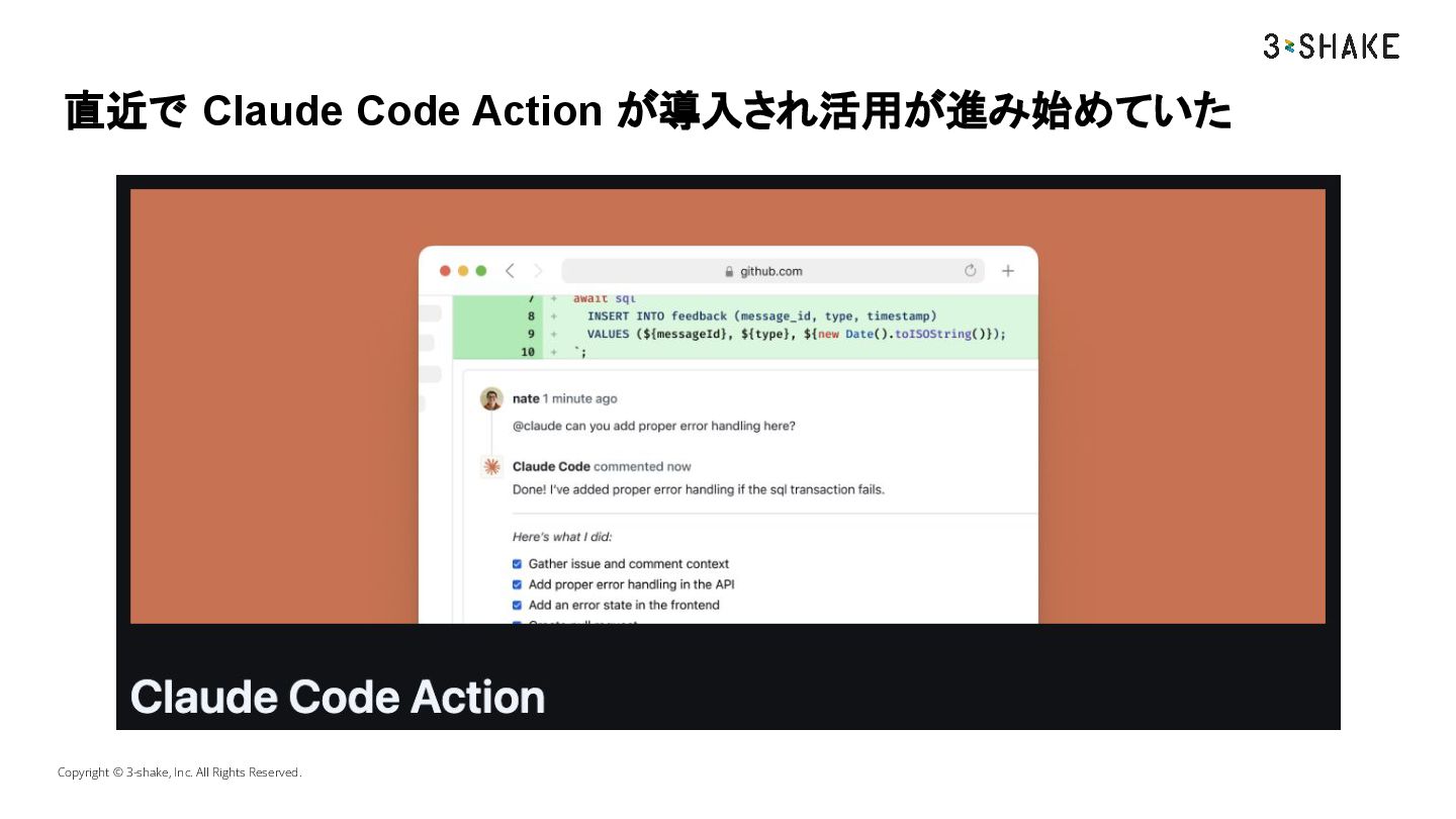 Copyright © 3-shake, Inc. All Rights Reserved. 直近で Claude Code
