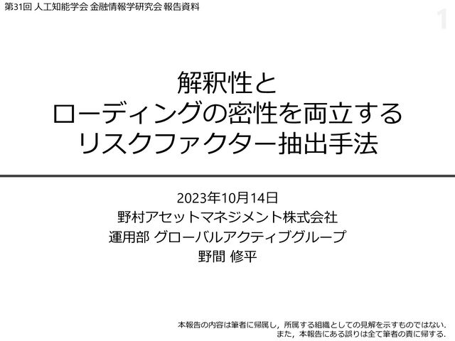 Investing, 20(1), (2011), pp. 137—147. ・T. Roncalli and G. Weisang : "Risk parity portfolios with risk factors.“ Quantitative Finance, 16(3), (2016), pp. 377—388. ・V. Bhansali, J. Davis, G. Rennison, J Hsu and F. Li : “The risk in risk parity: A factor-based analysis of asset-based risk parity.” The Journal of Investing, 21(3), (2012), pp. 102—110. ・伊藤彰朗・中川慧 “マクロファクターの定量化とリスク分析への活用” 証券アナリストジャーナル, 56(8), (2018), pp. 80—90. ・野間修平・中川慧・伊藤彰朗 “解釈性を持つマクロファクター構成手法” 第31回人工知能学会金融情報学研究会, 25, (2020), pp. 54—61. 45 序論 提案手法 数値実験 結論 補論