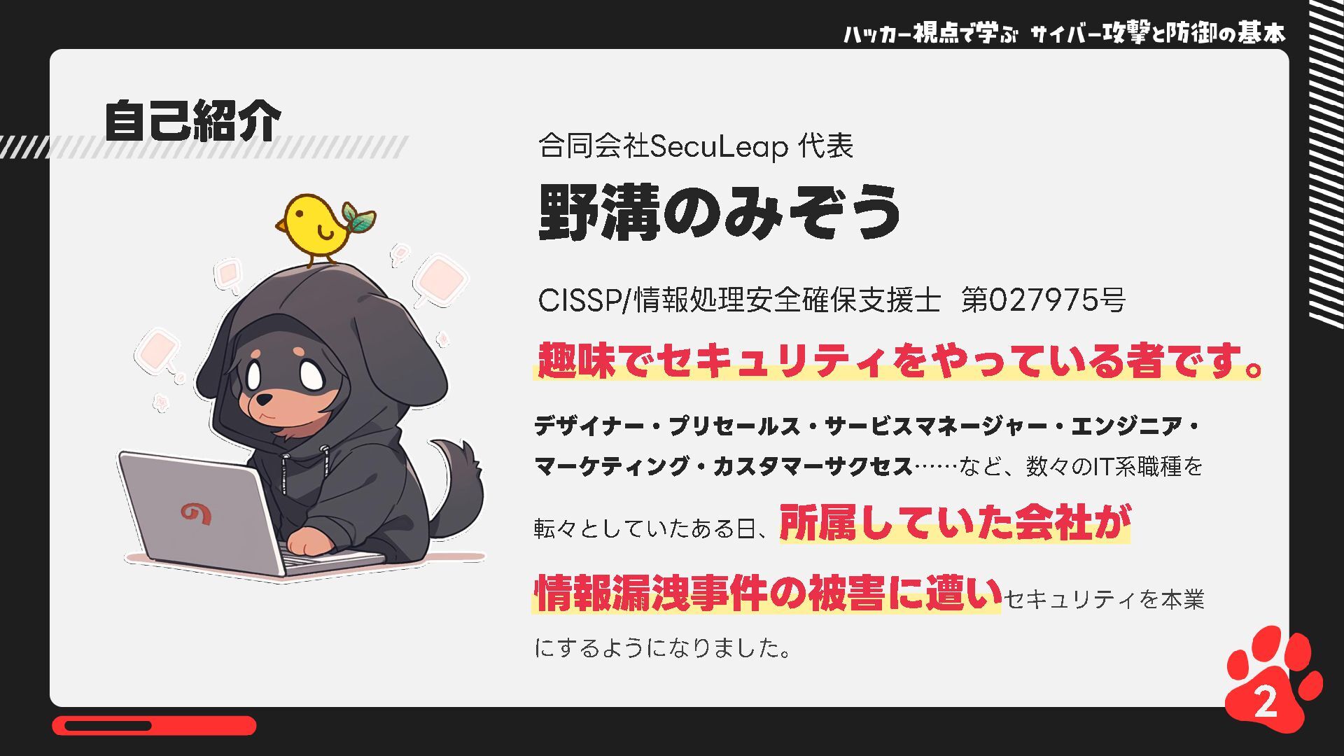 情報漏洩事件の被害に遭い セキュリティを本業 にするようになりました。 CISSP/ 情報処理安全確保支援士 第027975 号 合同会社SecuLeap 代表