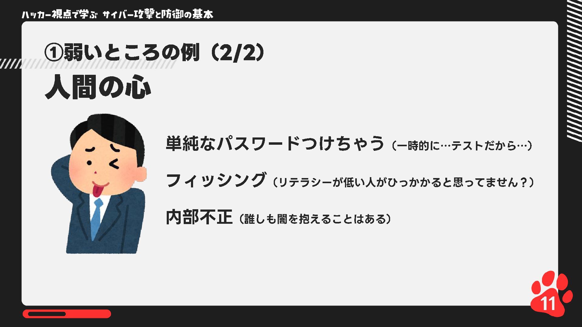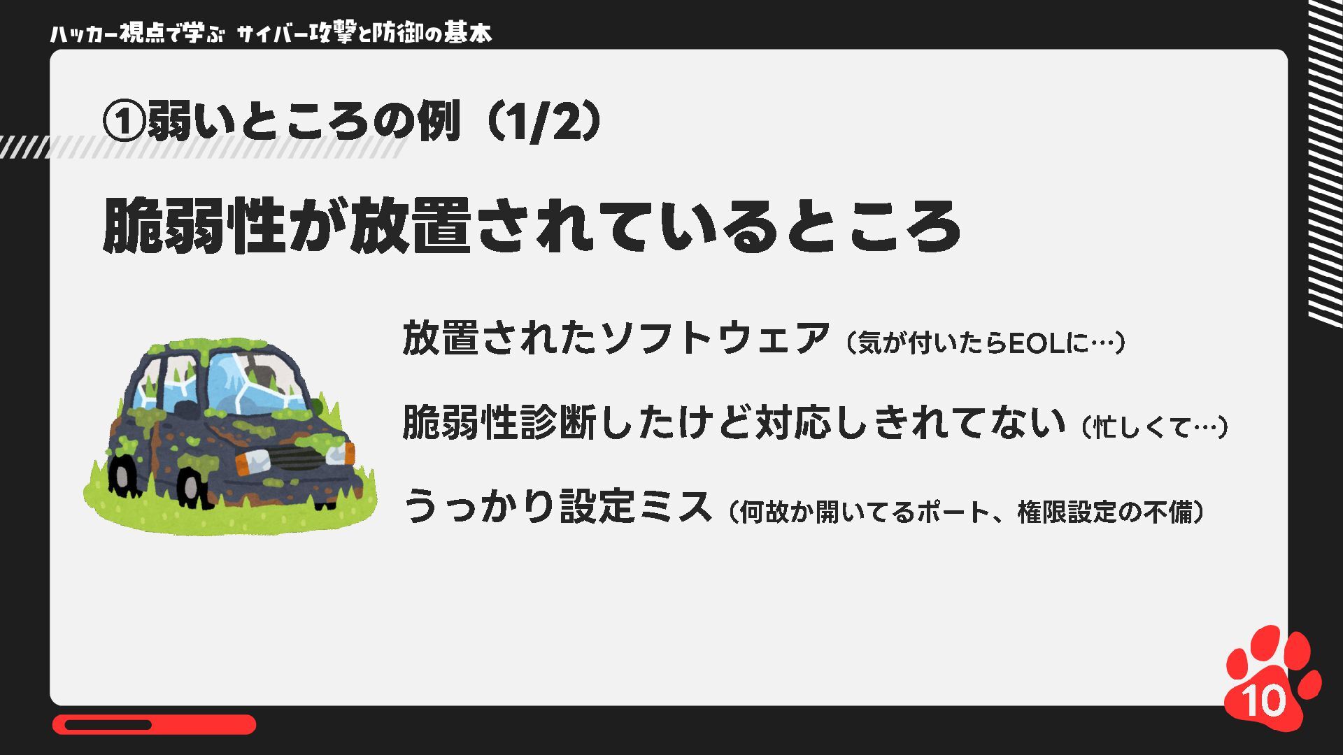 10 ①弱いところの例( 1/2 ) 脆弱性が放置されているところ 放置されたソフトウェア (気が付いたら EOL に…) 脆弱性診断したけど対応しきれてない