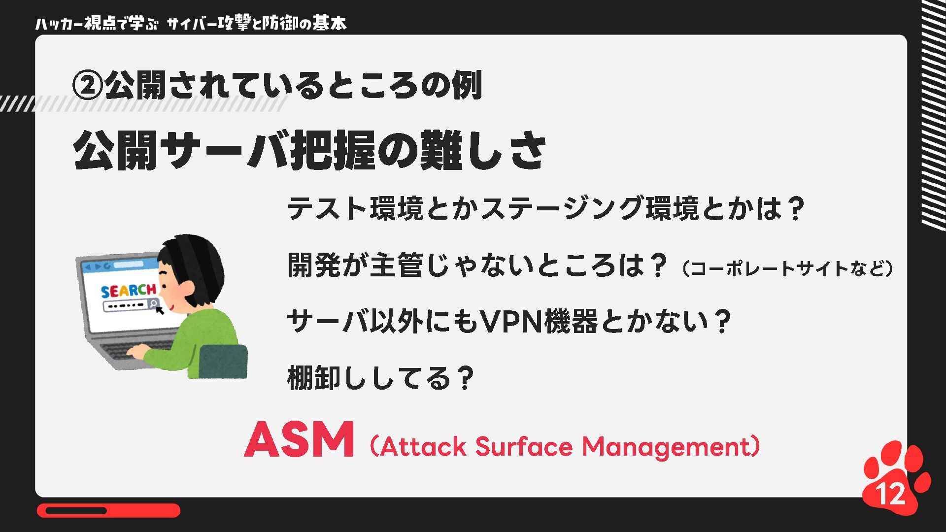 12 ②公開されているところの例 公開サーバ把握の難しさ 開発が主管じゃないところは? (コーポレートサイトなど) 棚卸ししてる? テスト環境とかステージング環境とかは? サーバ以外にも VPN 機器とかない?
