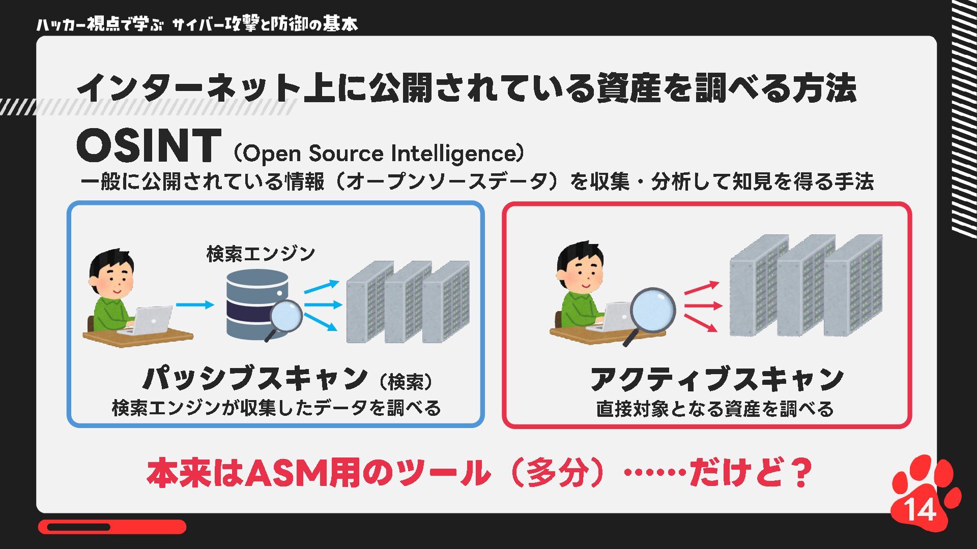 14 インターネット上に公開されている資産を調べる方法 OSINT ( Open Source Intelligence ) 一般に公開されている情報(オープンソースデータ)を収集・分析して知見を得る手法 本来はASM
