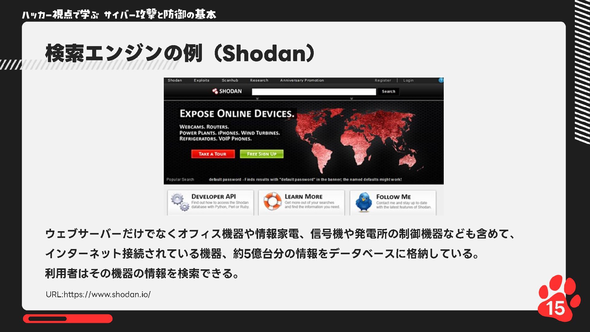 用のツール (多分) ……だけど? アクティブスキャン パッシブスキャン (検索) 直接対象となる資産を調べる 検索エンジンが収集したデータを調べる 検索エンジン