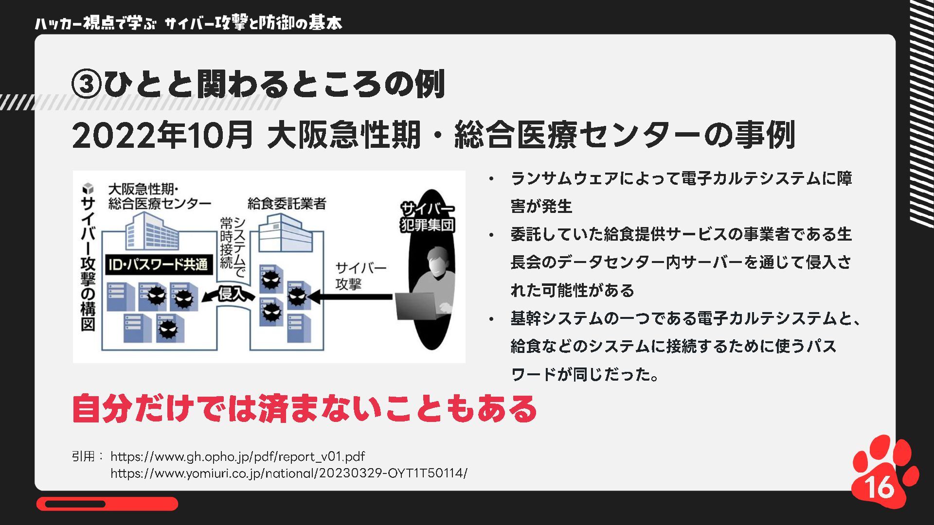 -OYT1T50114/ • ランサムウェアによって電子カルテシステムに障 害が発生 • 委託していた給食提供サービスの事業者である生 長会のデータセンター内サーバーを通じて侵入さ れた可能性がある • 基幹システムの一つである電子カルテシステムと、 給食などのシステムに接続するために使うパス ワードが同じだった。