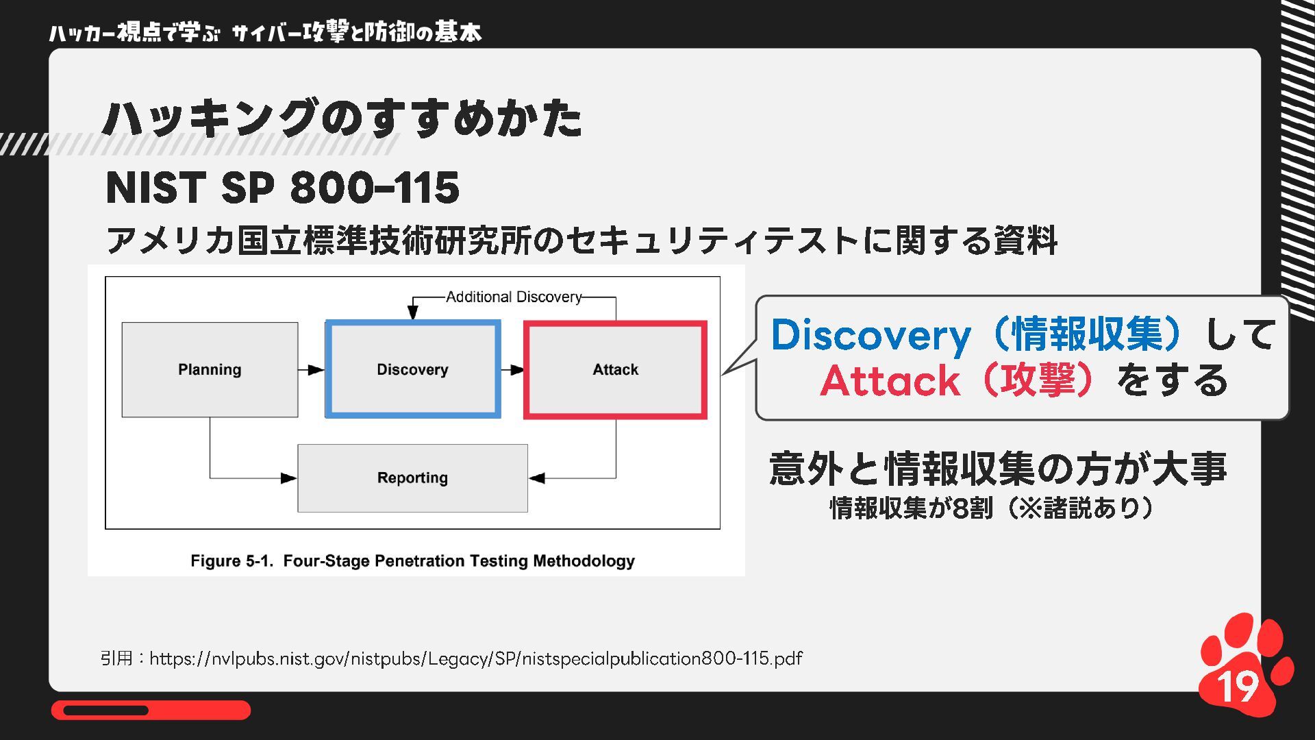 19 ハッキングのすすめかた NIST SP 800 –115 アメリカ国立標準技術研究所 のセキュリティテストに関する資料 引用: https://nvlpubs.nist.gov/nistpubs/Legacy/SP/nistspecialpublication800