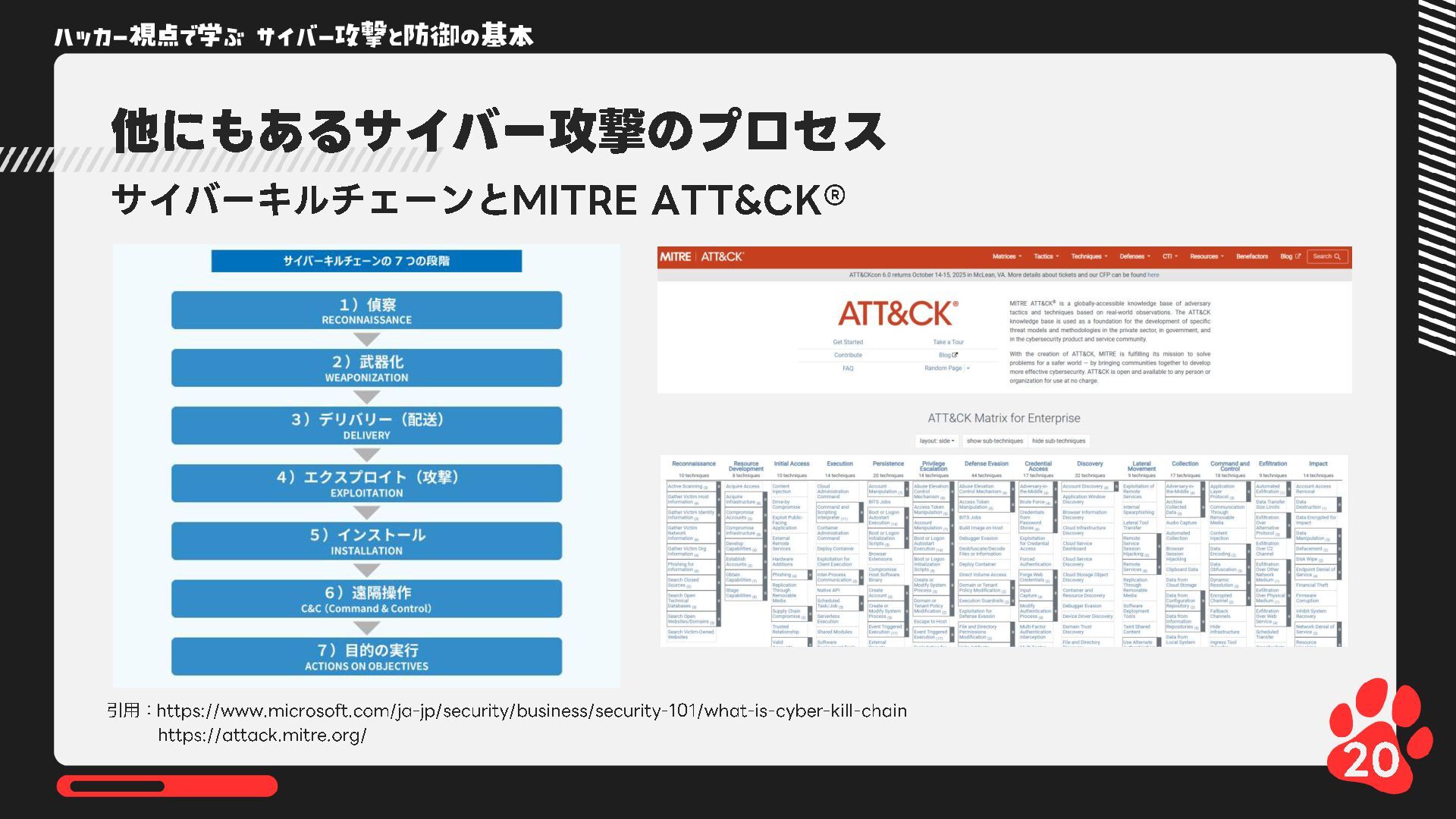 20 他にもあるサイバー攻撃のプロセス サイバーキルチェーンと MITRE ATT&CK® 引用: https://www.microsoft.com/ja -jp/security/business/security -101/what -is-cyber