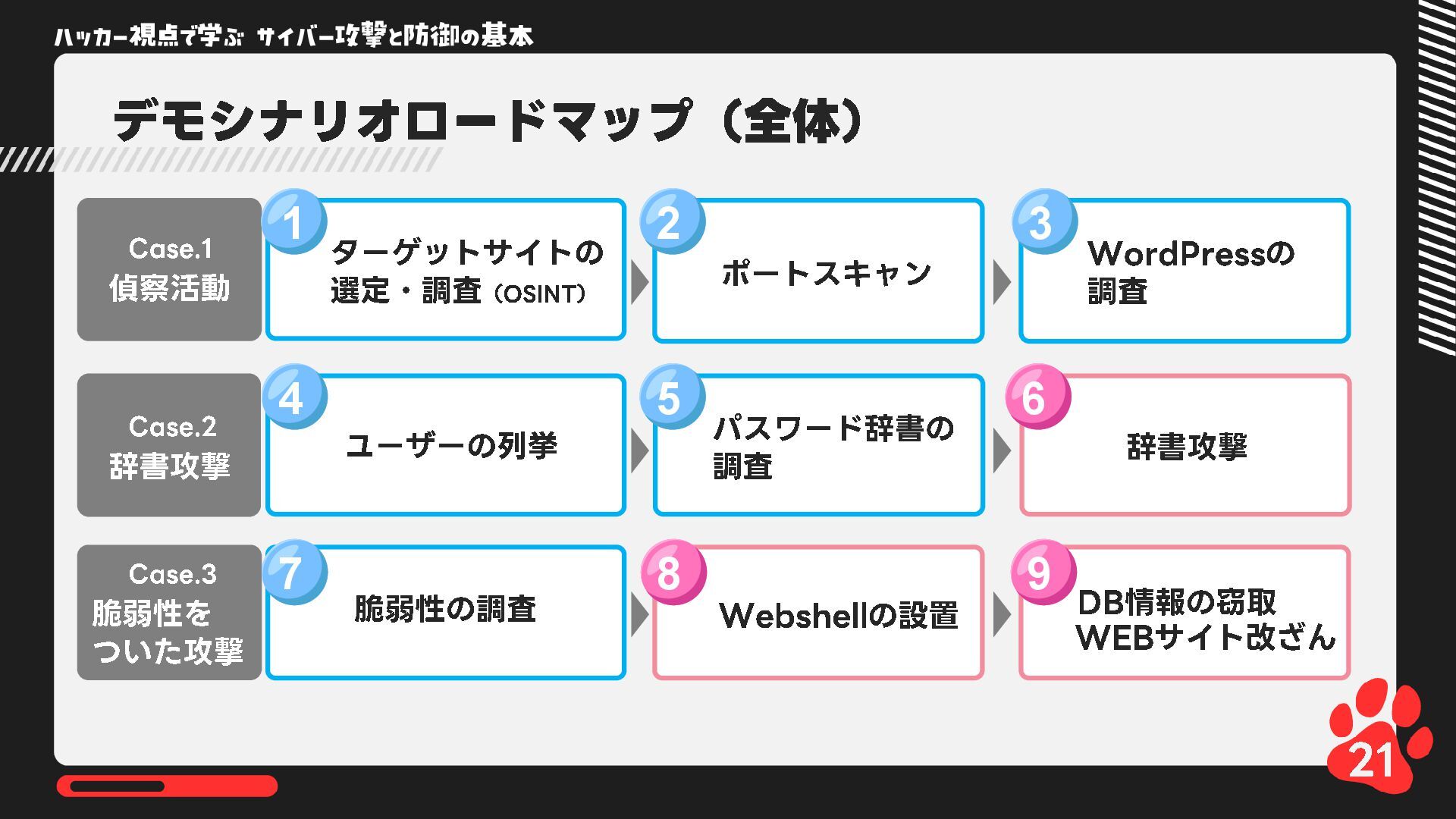 46 デモシナリオロードマップ(全体) ターゲットサイトの 選定・調査 ( OSINT ) Case.1 ポートスキャン WordPress