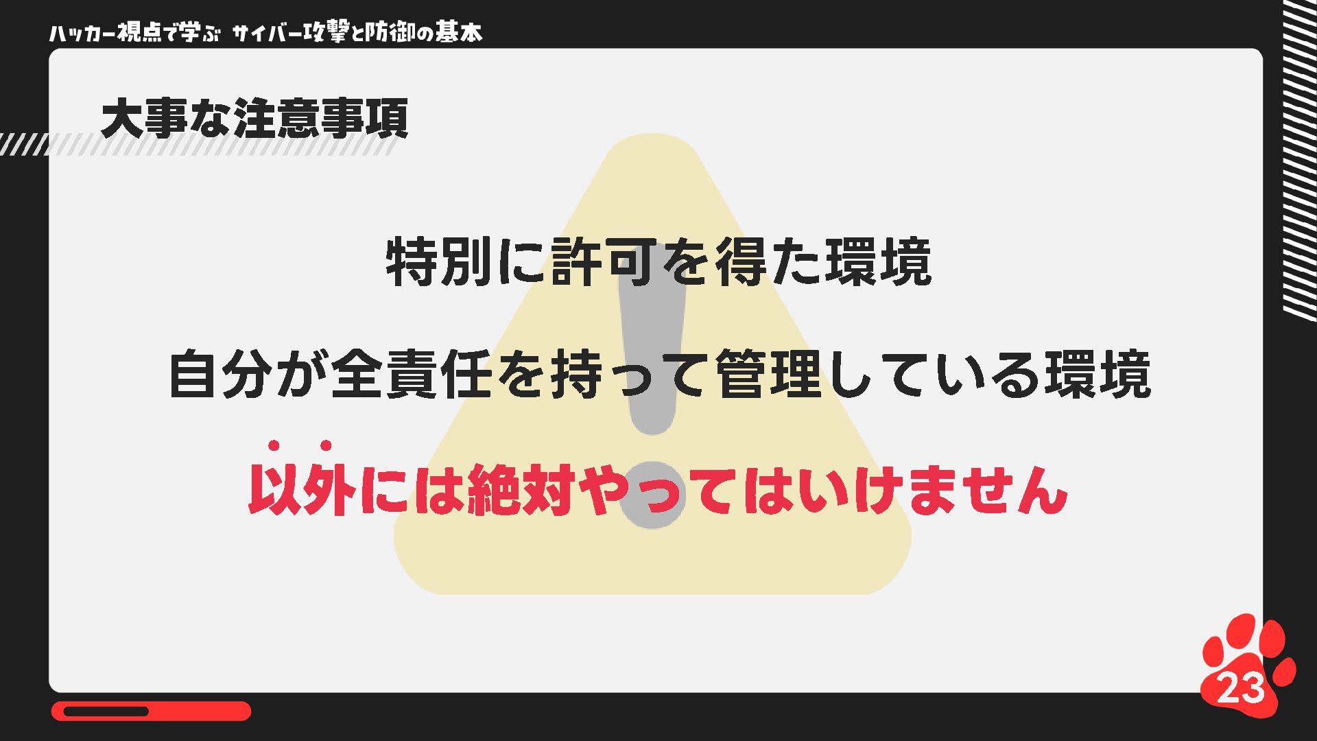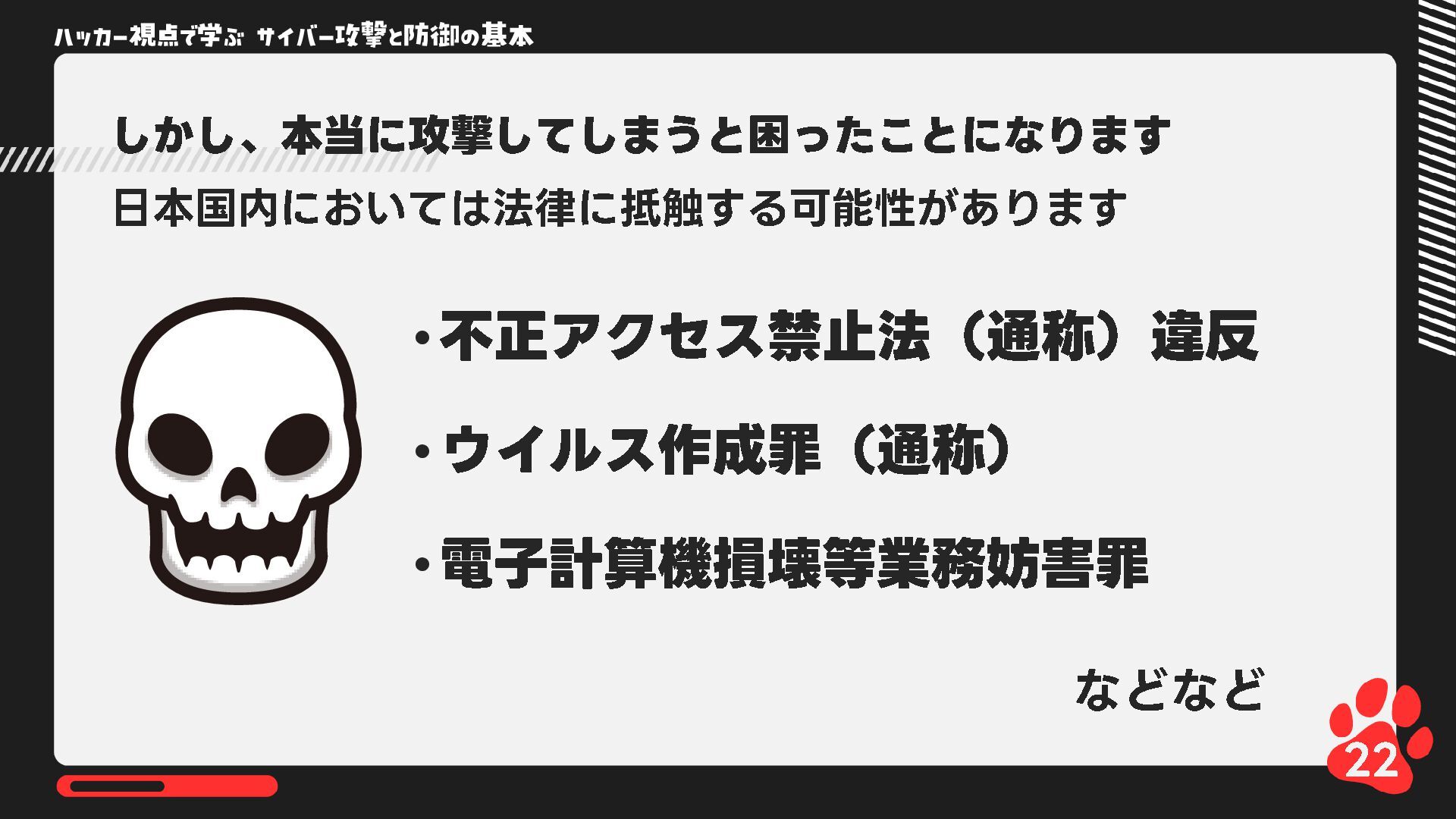 22 しかし、本当に攻撃してしまうと困ったことになります 日本国内においては法律に抵触する可能性があります •不正アクセス禁止法(通称)違反 •ウイルス作成罪(通称) •電子計算機損壊等業務妨害罪 などなど