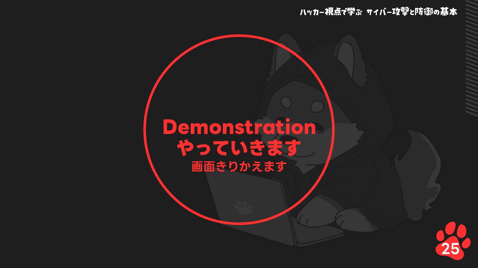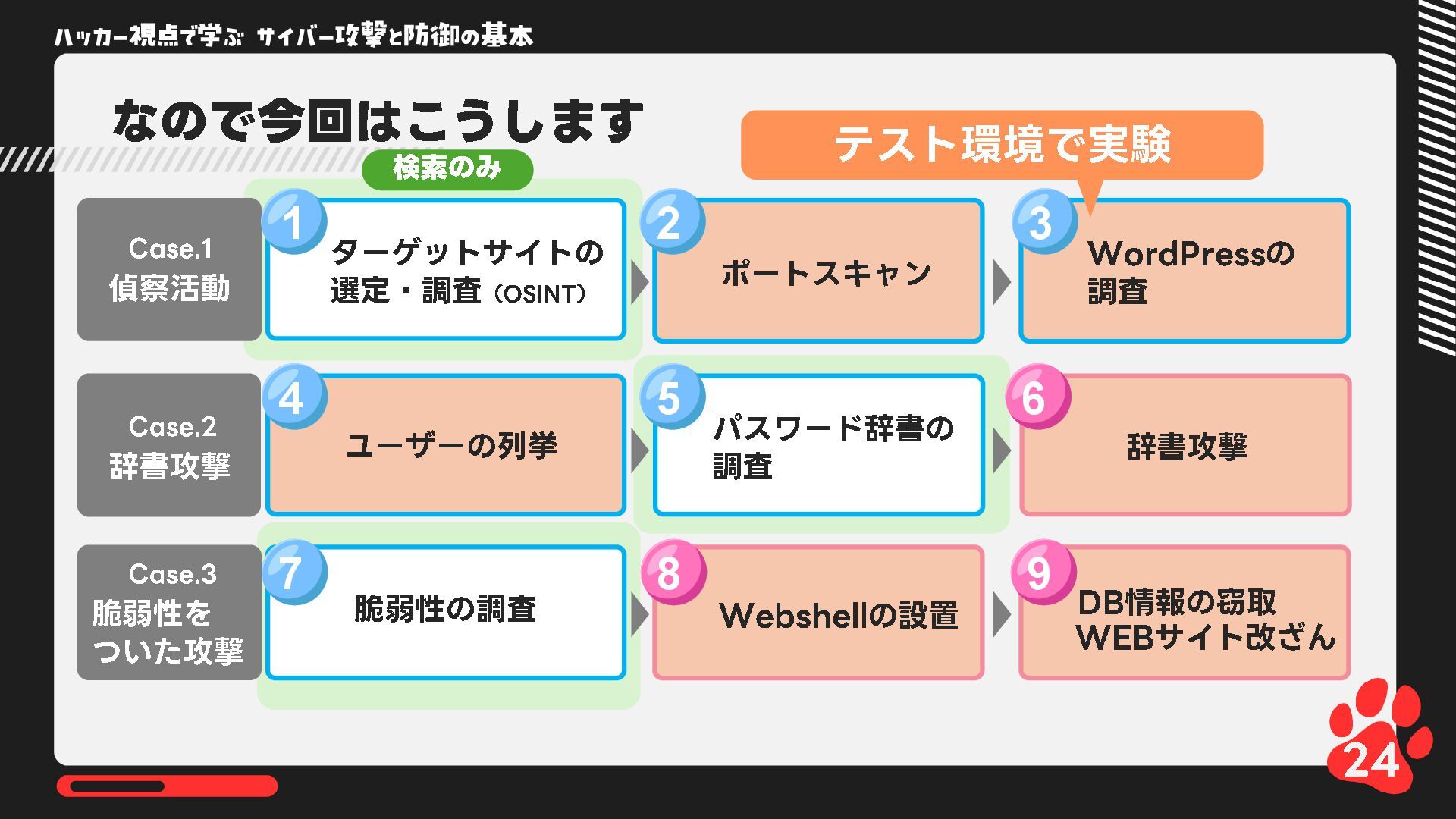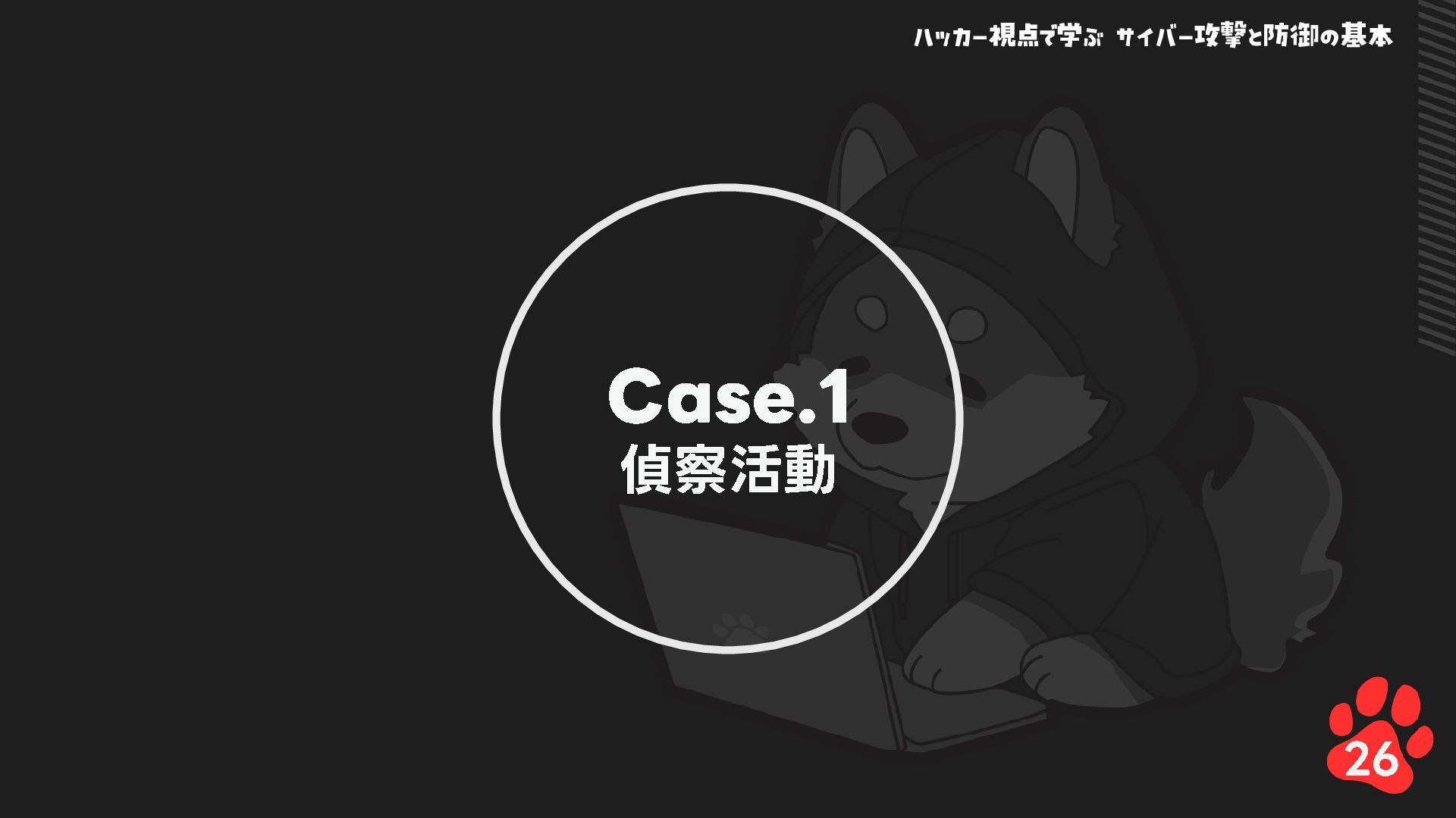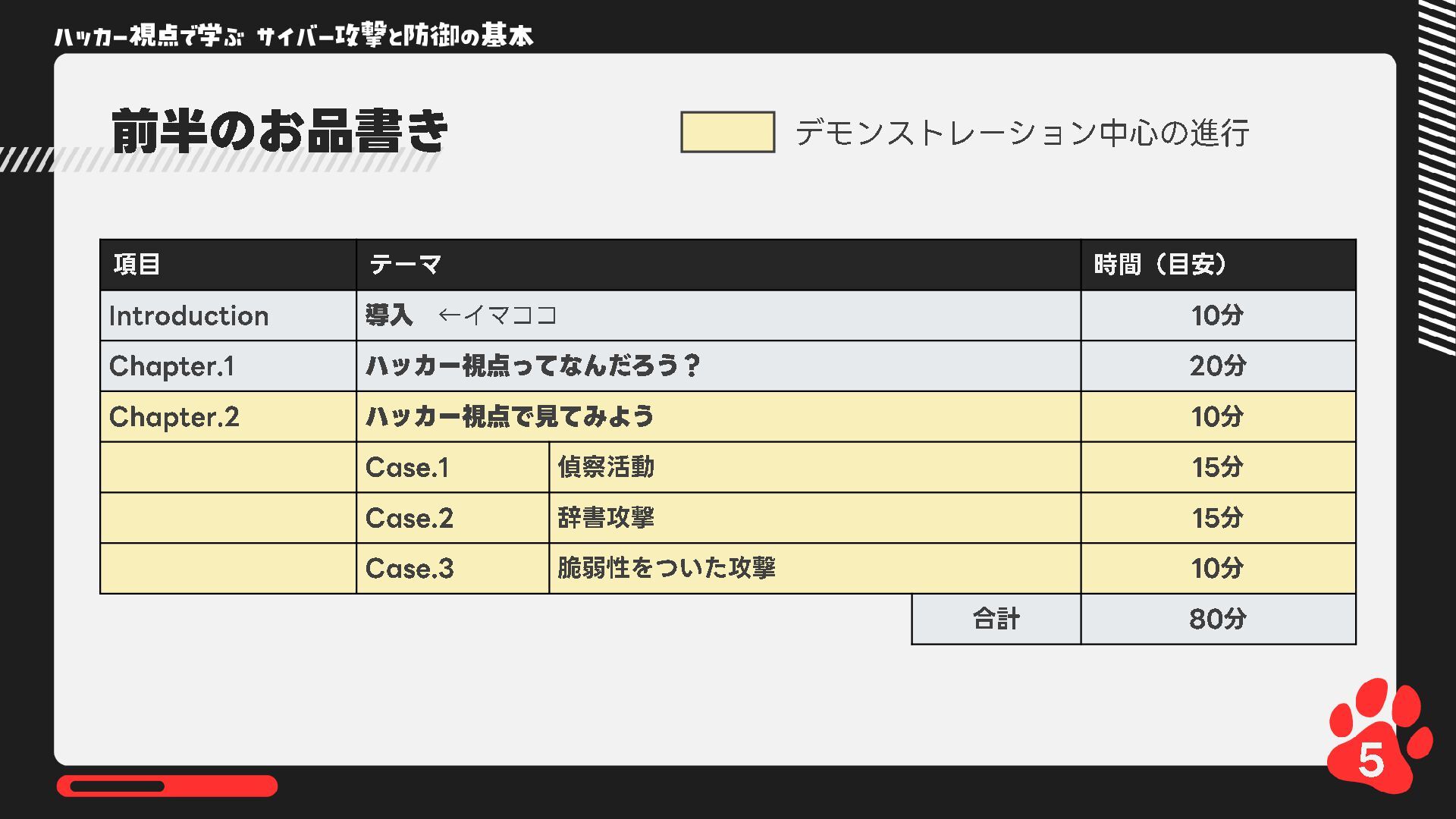 Chapter.1 ハッカー視点ってなんだろう? 20 分 Chapter.2 ハッカー視点で見てみよう 10 分 Case.1 偵察活動 15分 Case.2 辞書攻撃 15分 Case.3 脆弱性をついた攻撃 10 分 合計 80 分 デモンストレーション中心の進行
