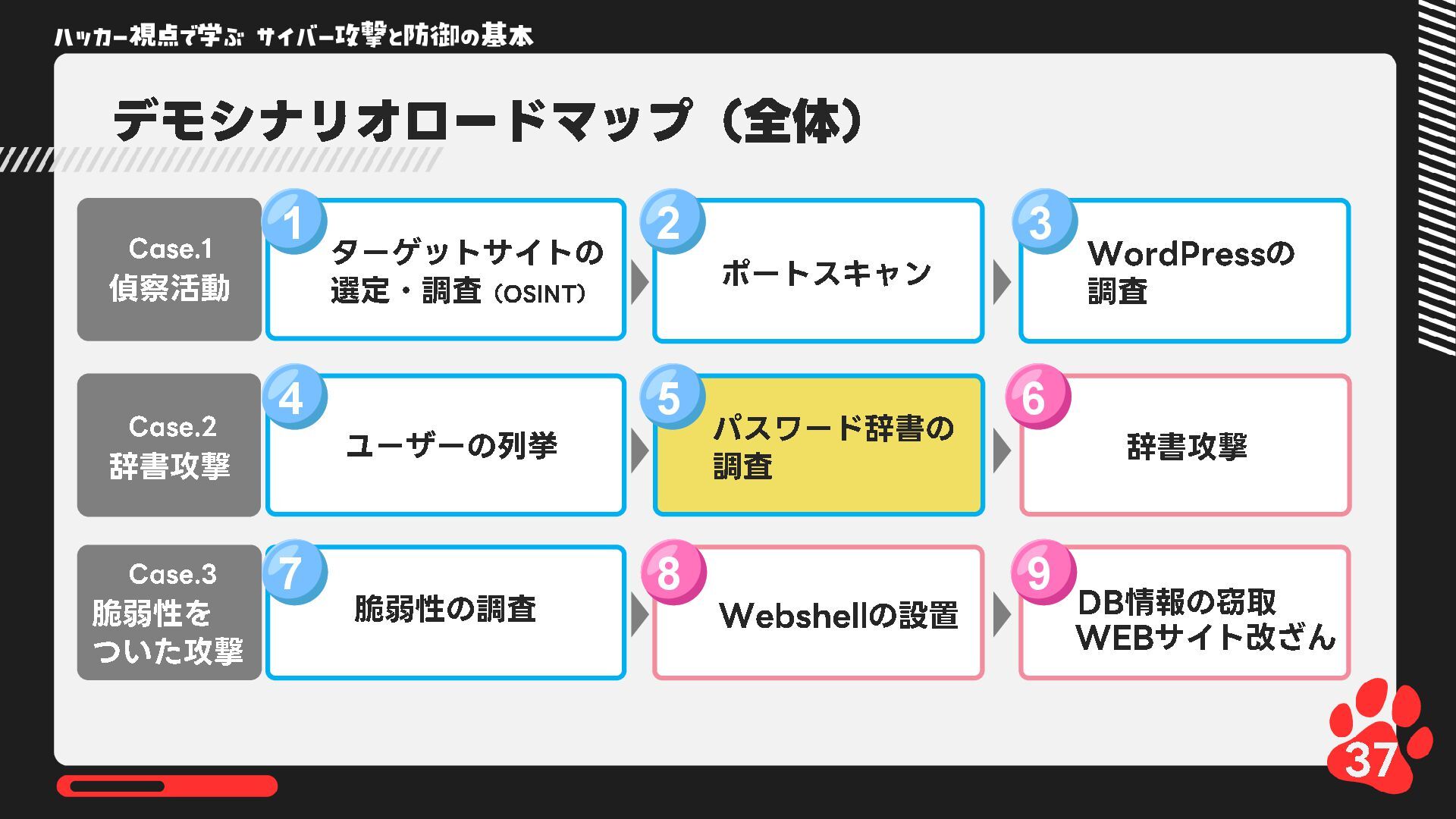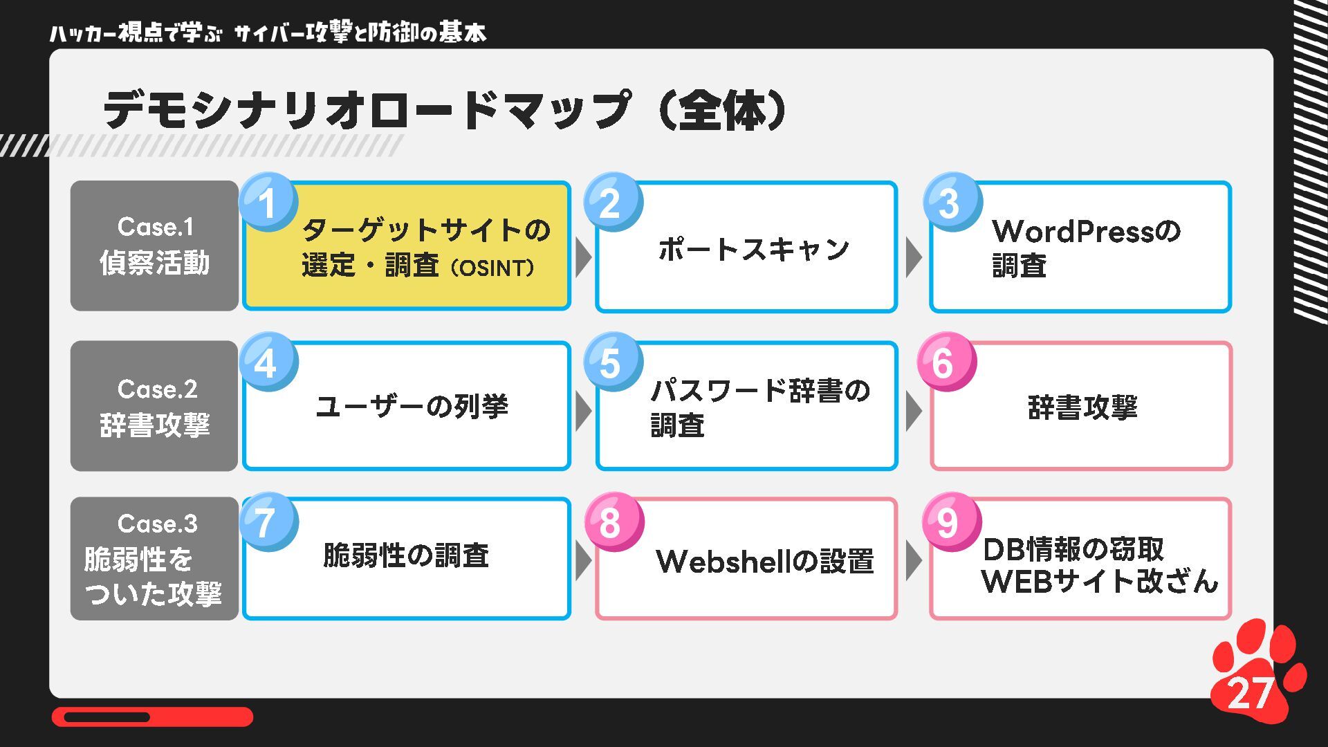 38 デモシナリオロードマップ(全体) ターゲットサイトの 選定・調査 ( OSINT ) Case.1 ポートスキャン WordPress