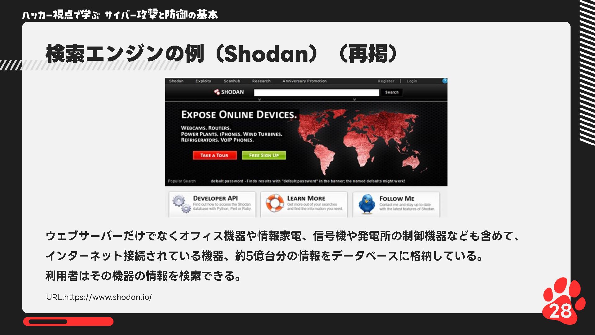 28 検索エンジンの例( Shodan )(再掲) ウェブサーバーだけでなくオフィス機器や情報家電、信号機や発電所の制御機器なども含めて、 インターネット接続されている機器、約 5 億台分の情報をデータベースに格納している。 利用者はその機器の情報を検索できる。 URL: