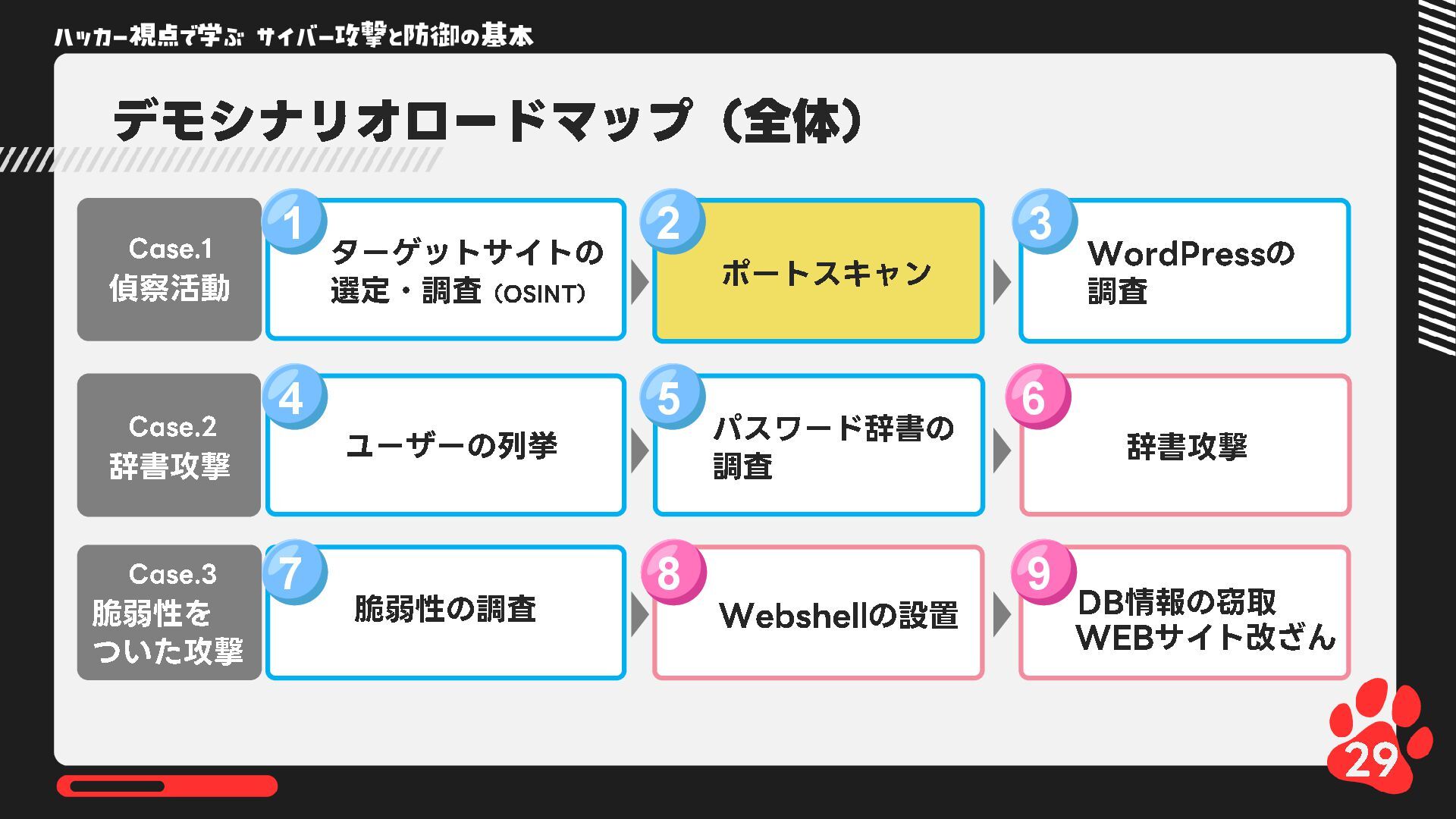 30 デモシナリオロードマップ(全体) ターゲットサイトの 選定・調査 ( OSINT ) Case.1 ポートスキャン WordPress