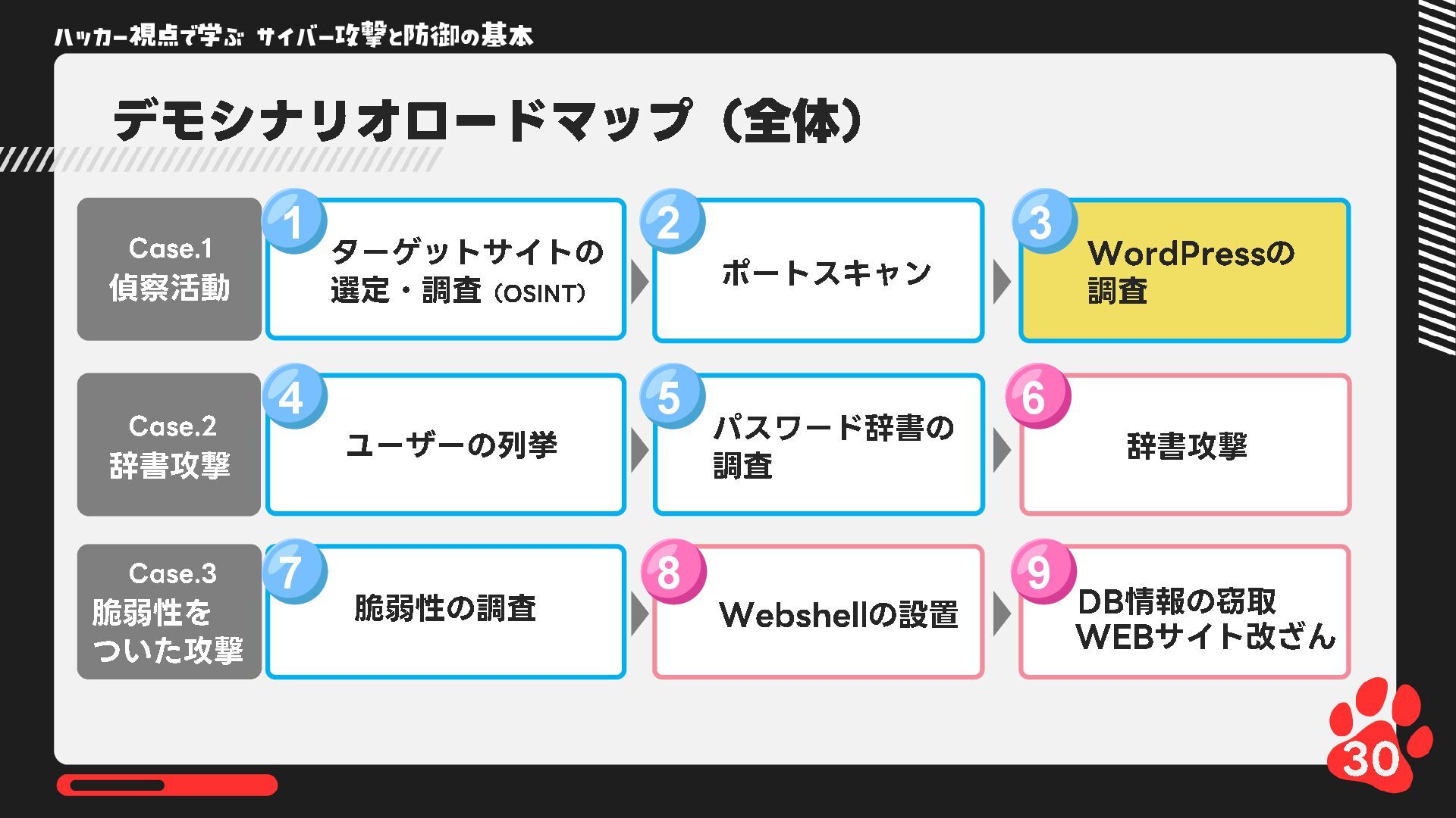 29 デモシナリオロードマップ(全体) ターゲットサイトの 選定・調査 ( OSINT ) Case.1 ポートスキャン WordPress