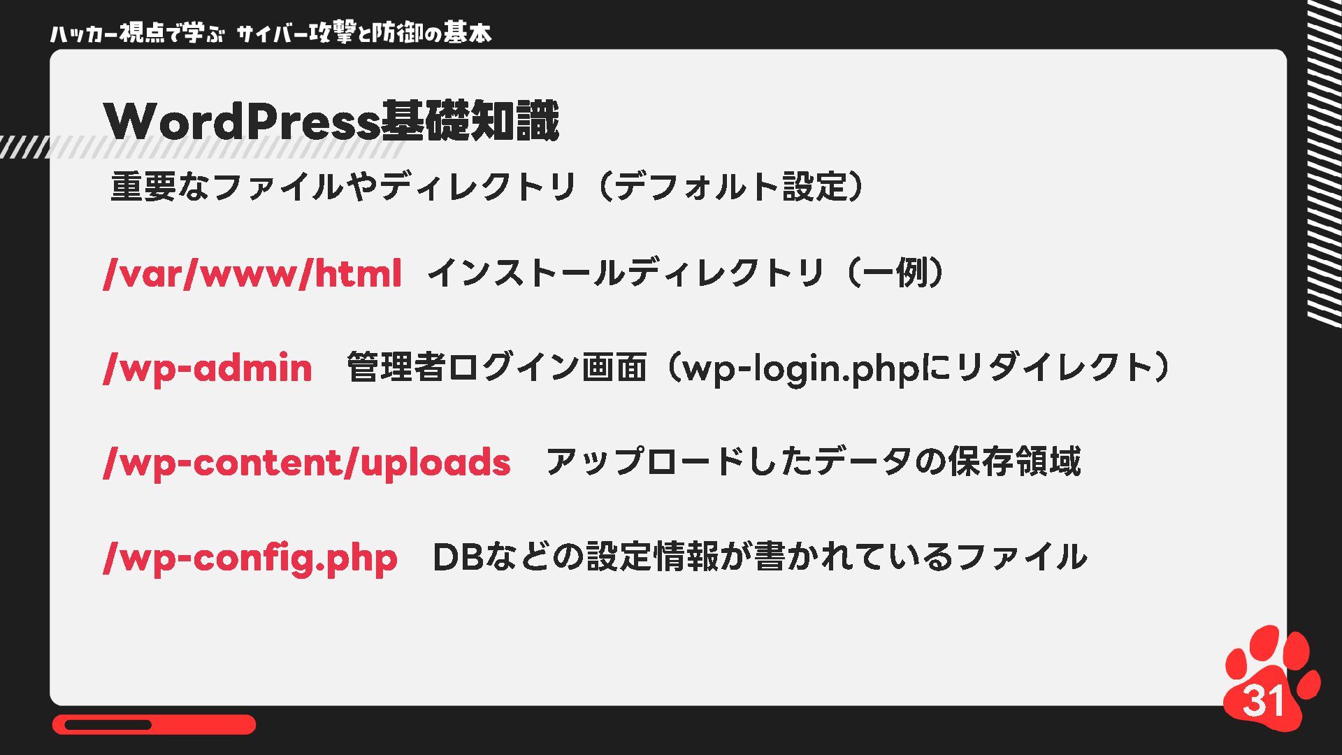 31 WordPress 基礎知識 /var/www/html インストールディレクトリ(一例) /wp -admin 管理者ログイン画面( wp -login.php