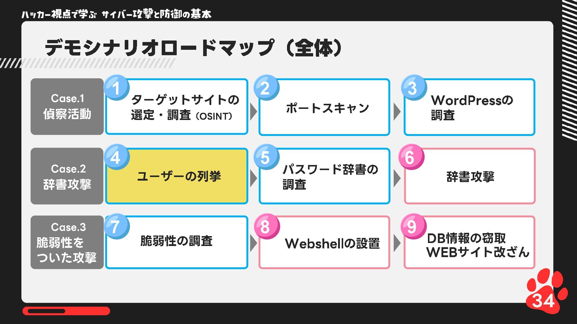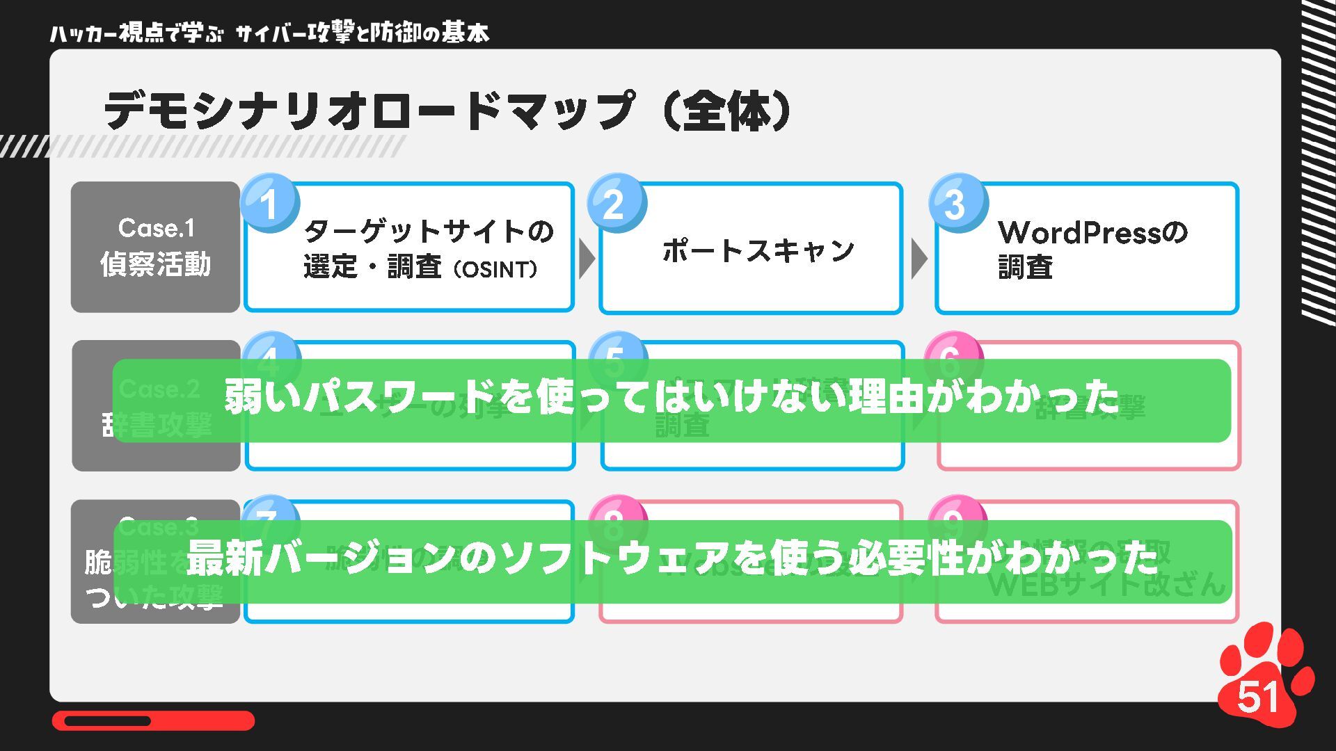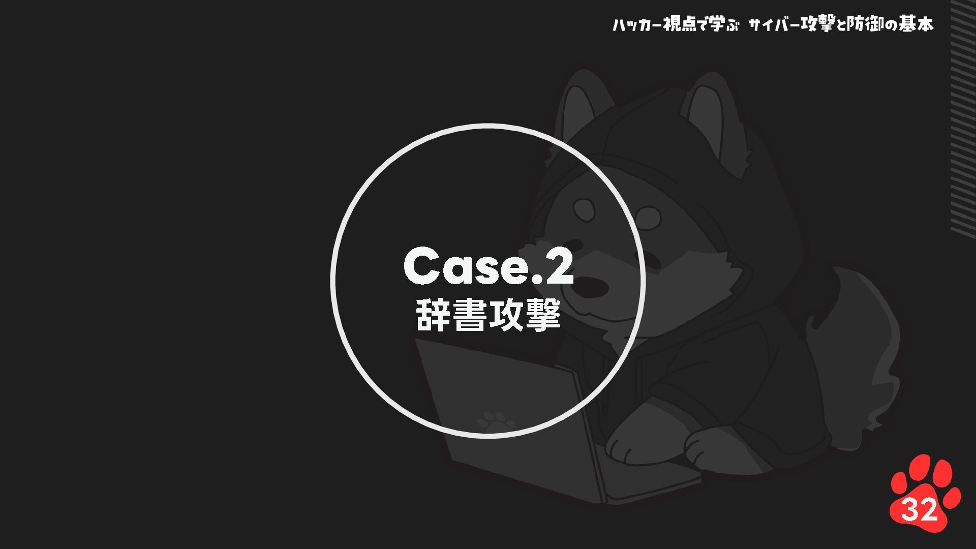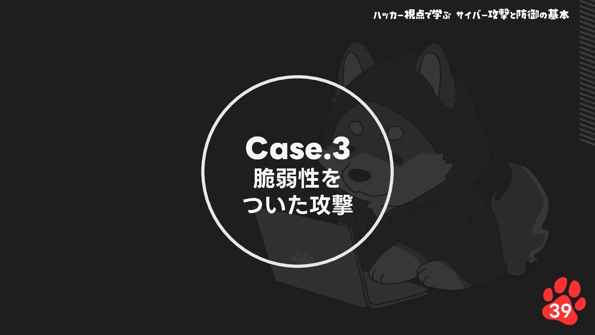 の 調査 ユーザーの列挙 パスワード辞書の 調査 Webshell の設置 DB 情報の窃取 WEB サイト改ざん 偵察活動 脆弱性の調査 辞書攻撃 Case.2 辞書攻撃 Case.3 脆弱性を ついた攻撃 弱いパスワードを使ってはいけない理由がわかった 最新バージョンのソフトウェアを使う必要性がわかった