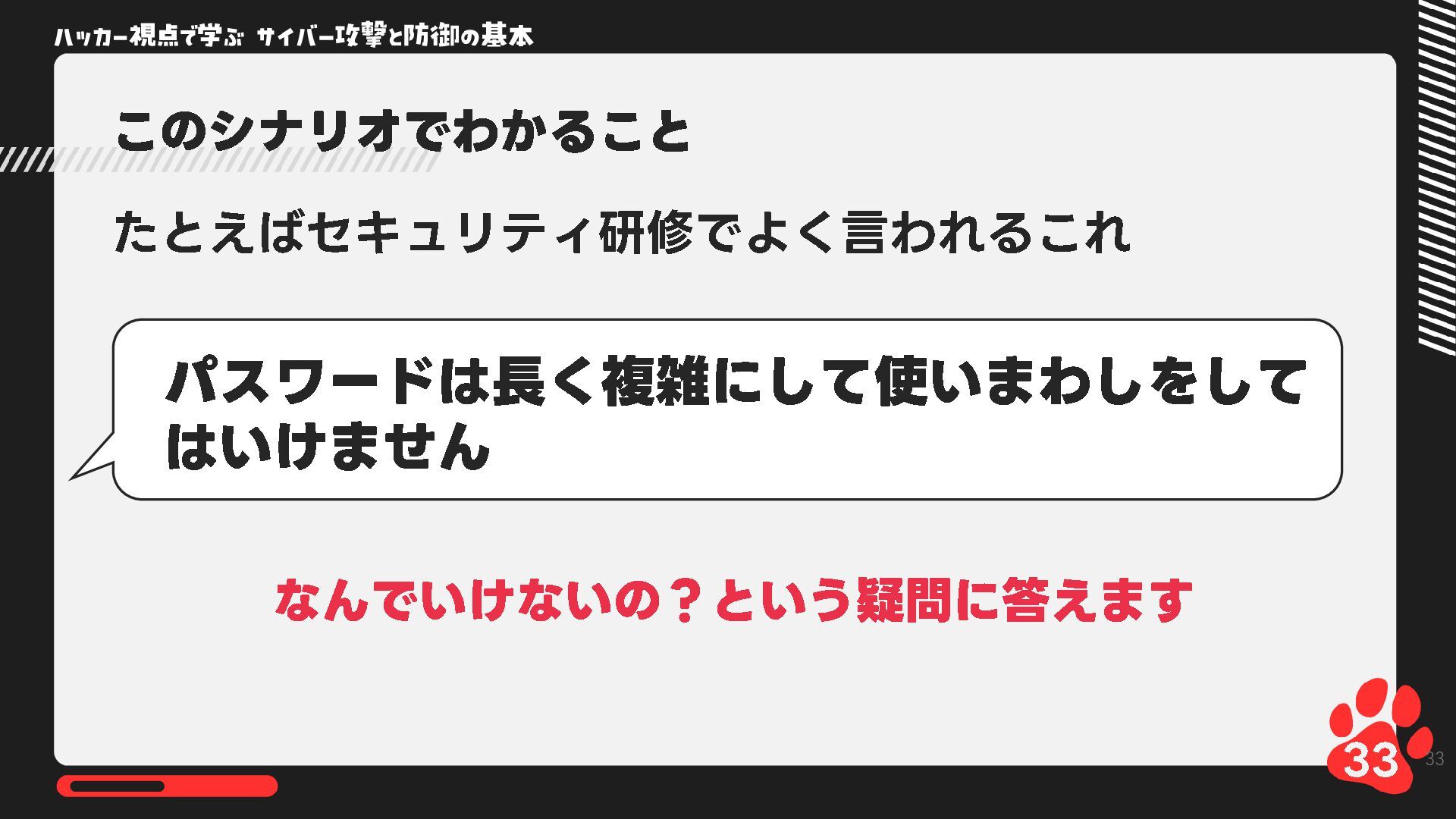 33 このシナリオでわかること 33 パスワードは長く複雑にして使いまわしをして はいけません なんでいけないの?という疑問に答えます たとえばセキュリティ研修でよく言われるこれ