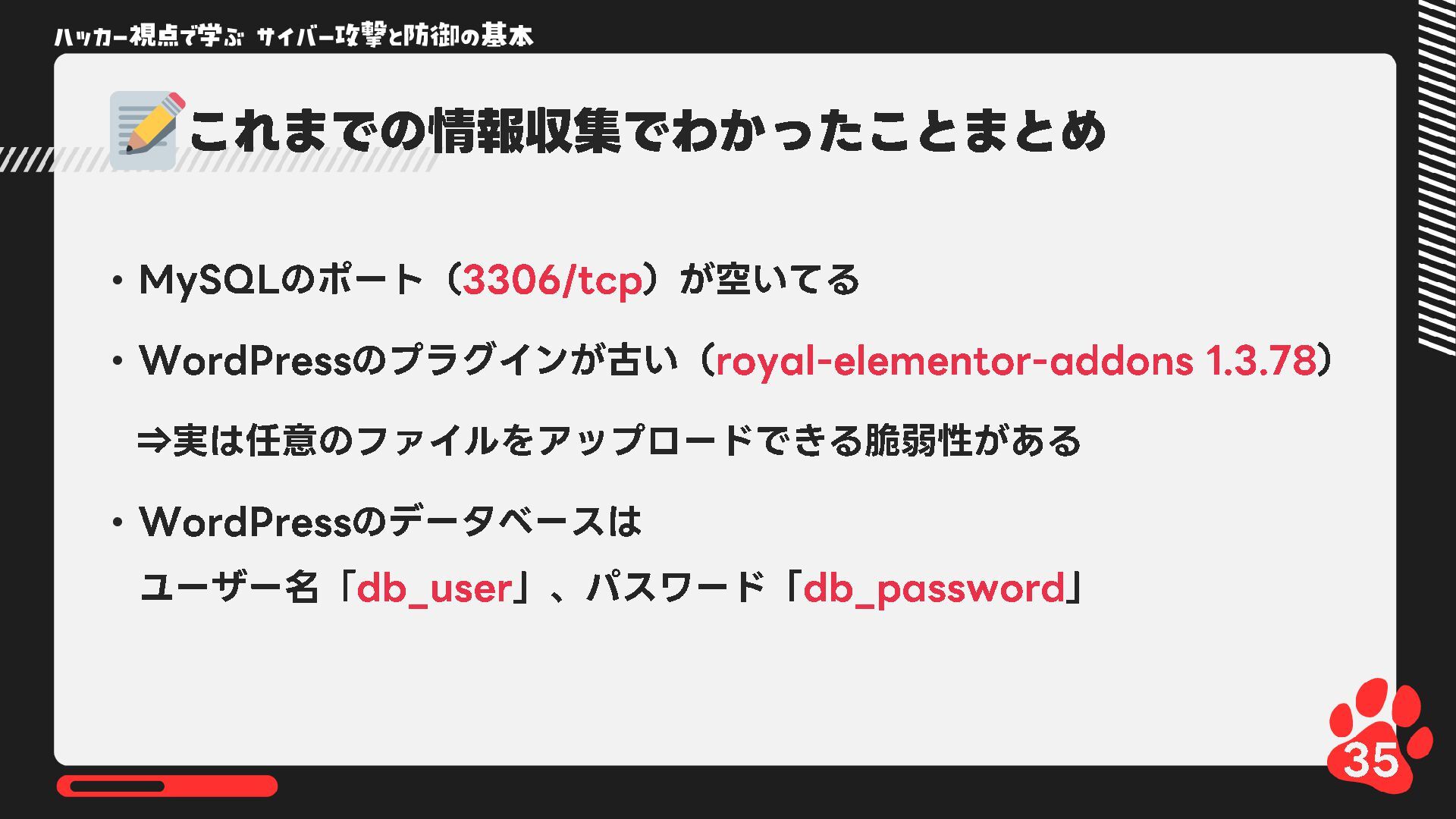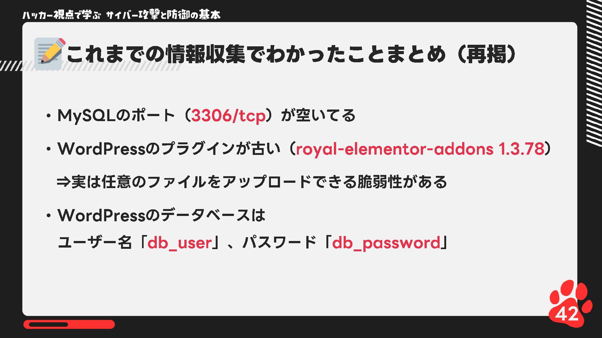royal -elementor -addons 1.3.78 ) ⇒実は任意のファイルをアップロードできる脆弱性がある • WordPress のデータベースは ユーザー名「 db_user 」、パスワード「 db_password 」