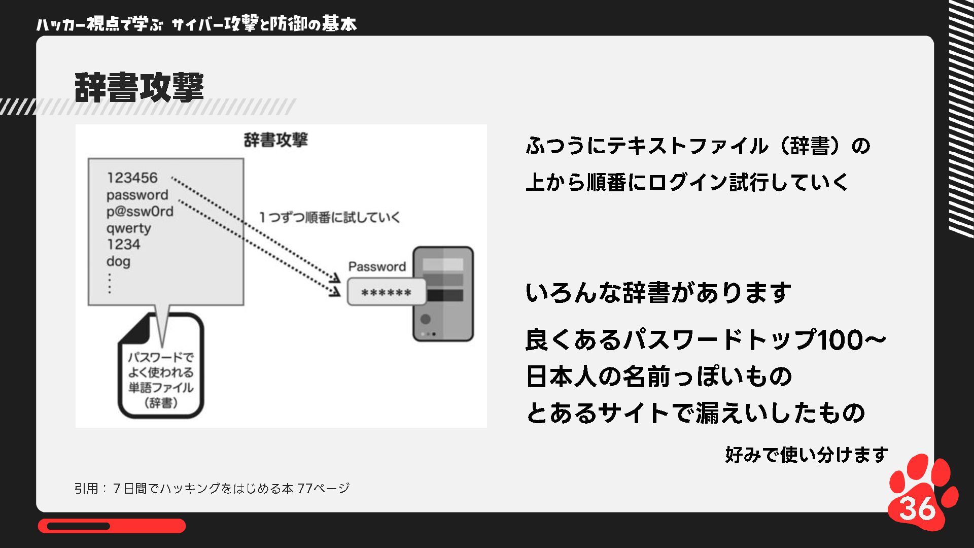 36 辞書攻撃 引用:7日間でハッキングをはじめる本 77 ページ ふつうにテキストファイル(辞書)の 上から順番にログイン試行していく 良くあるパスワードトップ 100 ~