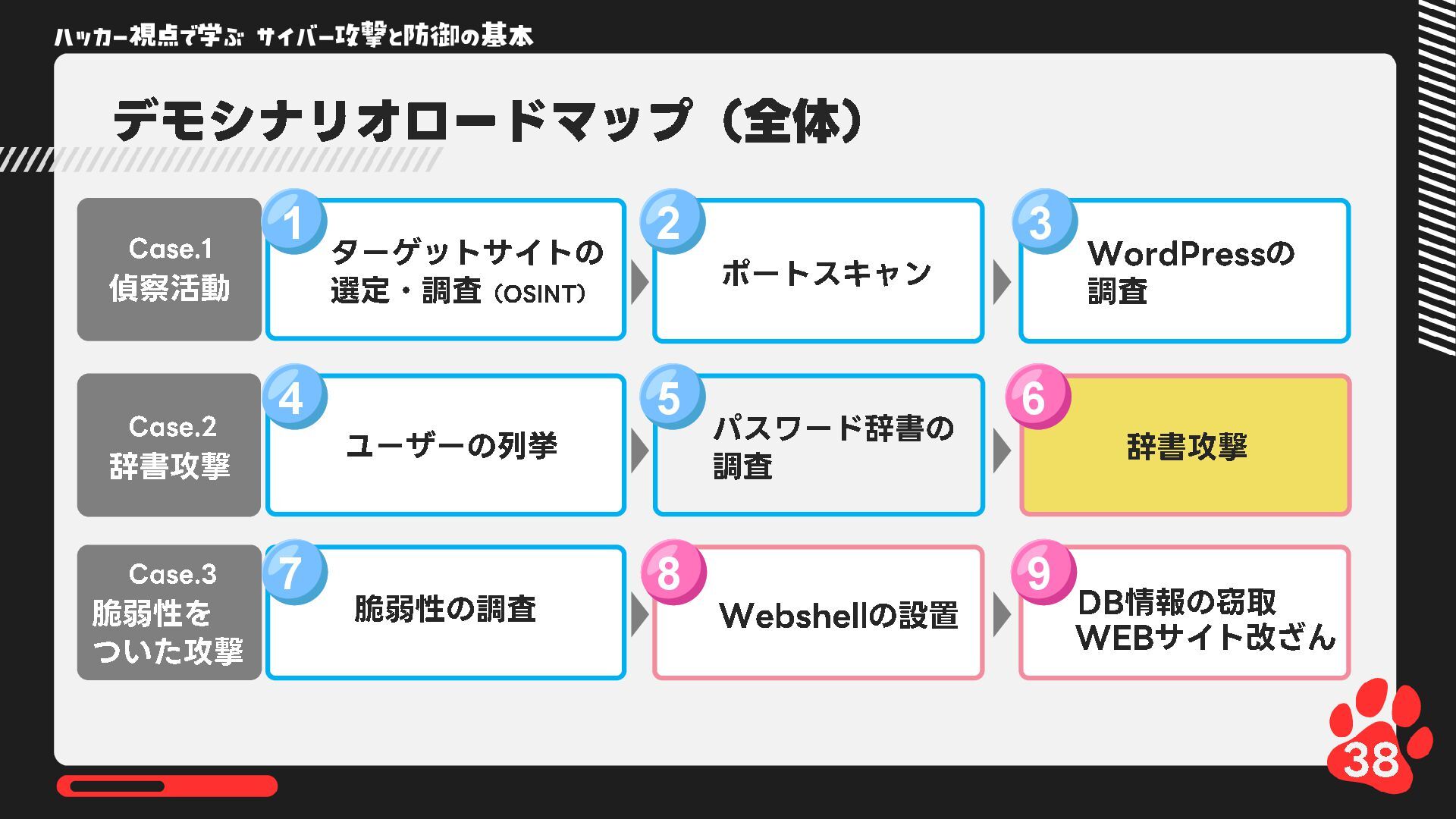 37 デモシナリオロードマップ(全体) ターゲットサイトの 選定・調査 ( OSINT ) Case.1 ポートスキャン WordPress