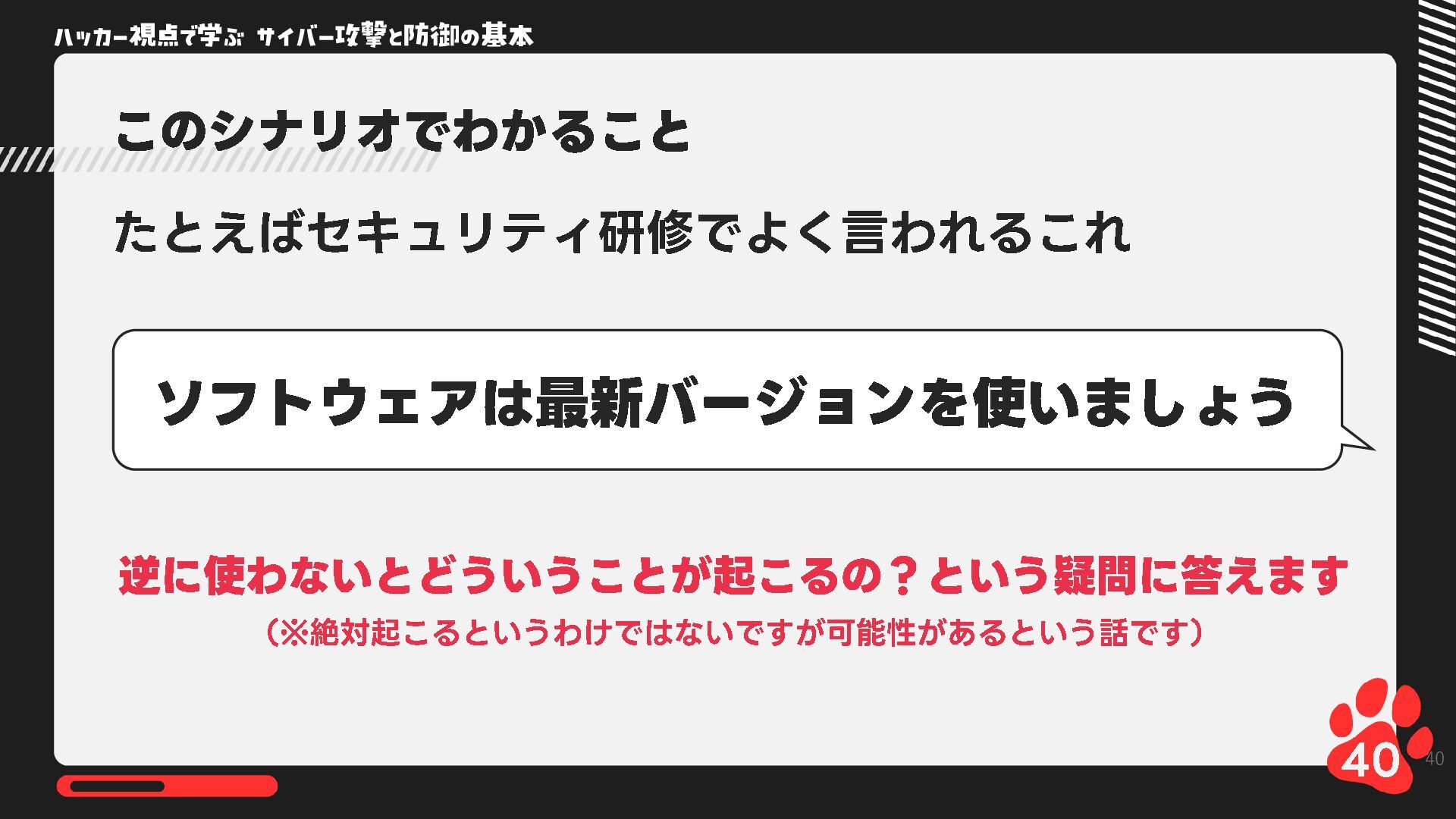 40 このシナリオでわかること 40 ソフトウェアは最新バージョンを使いましょう 逆に使わないとどういうことが起こるの?という疑問に答えます たとえばセキュリティ研修でよく言われるこれ ( ※絶対起こるというわけではないですが可能性があるという話です)