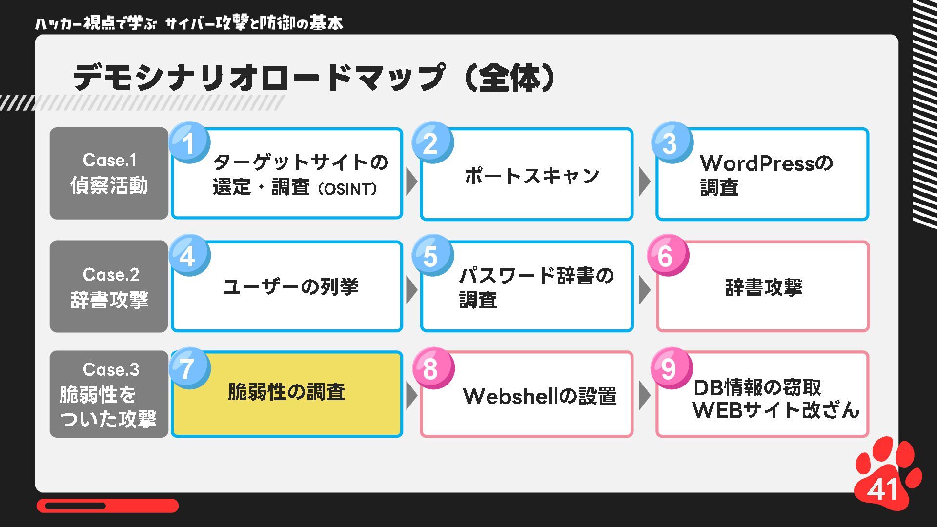 41 デモシナリオロードマップ(全体) ターゲットサイトの 選定・調査 ( OSINT ) Case.1 ポートスキャン WordPress