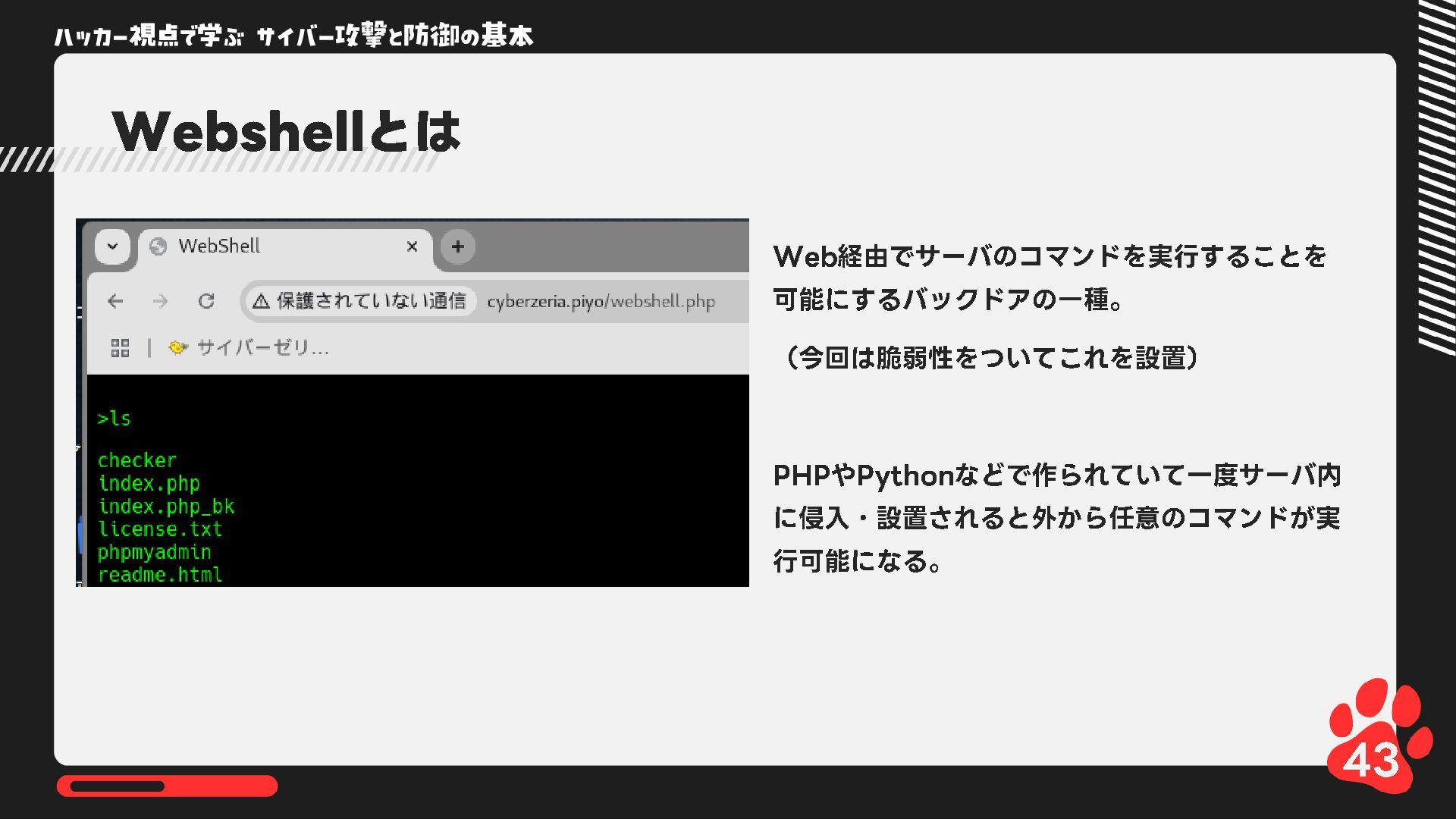 43 Webshell とは Web 経由でサーバのコマンドを実行することを 可能にするバックドアの一種。 (今回は脆弱性をついてこれを設置) PHP やPython などで作られていて一度サーバ内