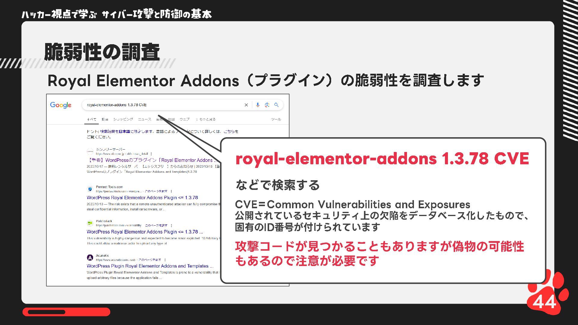 44 脆弱性の調査 Royal Elementor Addons (プラグイン)の脆弱性を調査します royal -elementor -addons 1.3.78