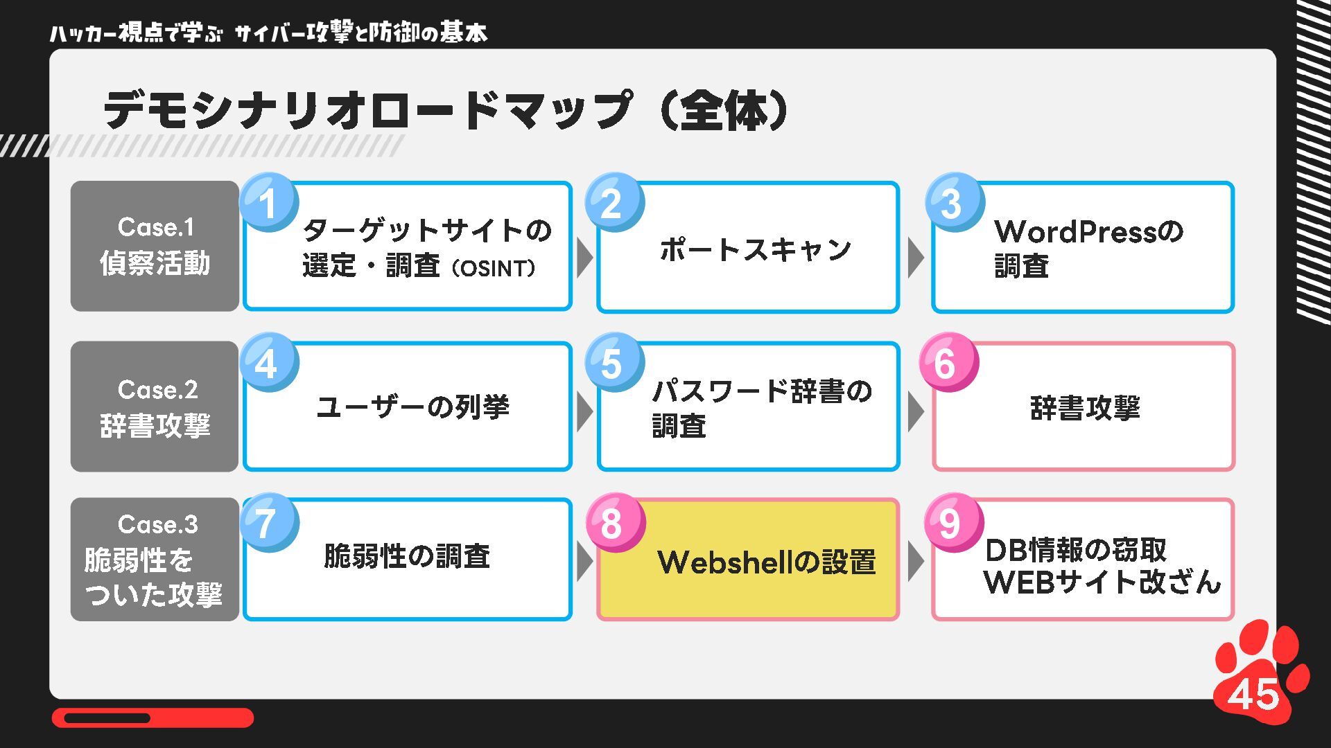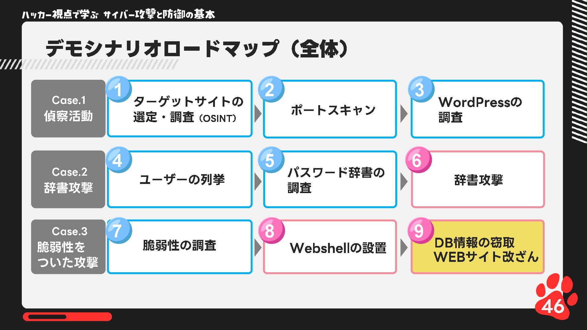 45 デモシナリオロードマップ(全体) ターゲットサイトの 選定・調査 ( OSINT ) Case.1 ポートスキャン WordPress