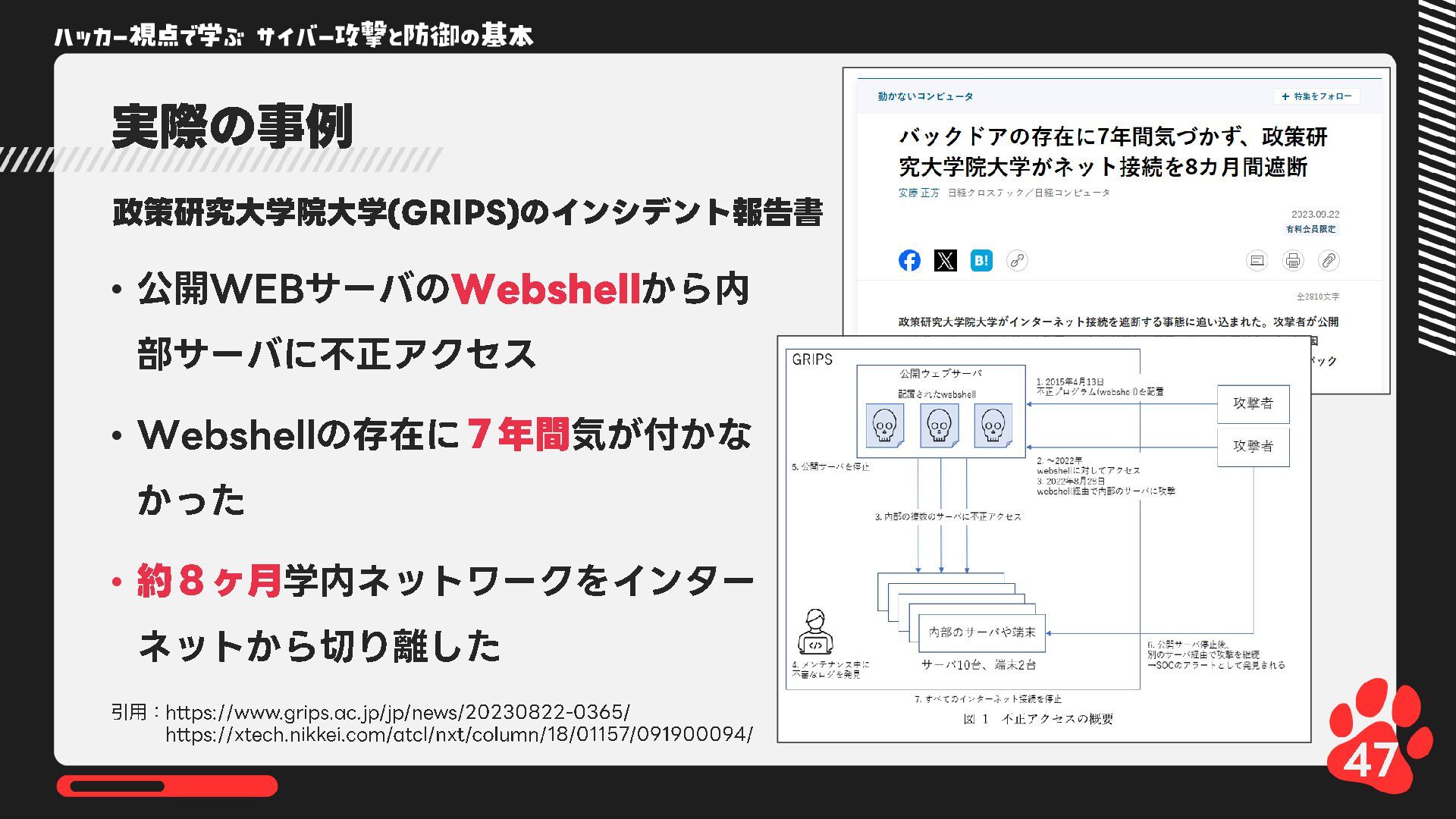 47 実際の事例 引用: https://www.grips.ac.jp/jp/news/20230822 -0365/ https://xtech.nikkei.com/atcl/nxt/column/18/01157/091900094/ 政策研究大学院大学(GRIPS) のインシデント報告書 • 公開WEB