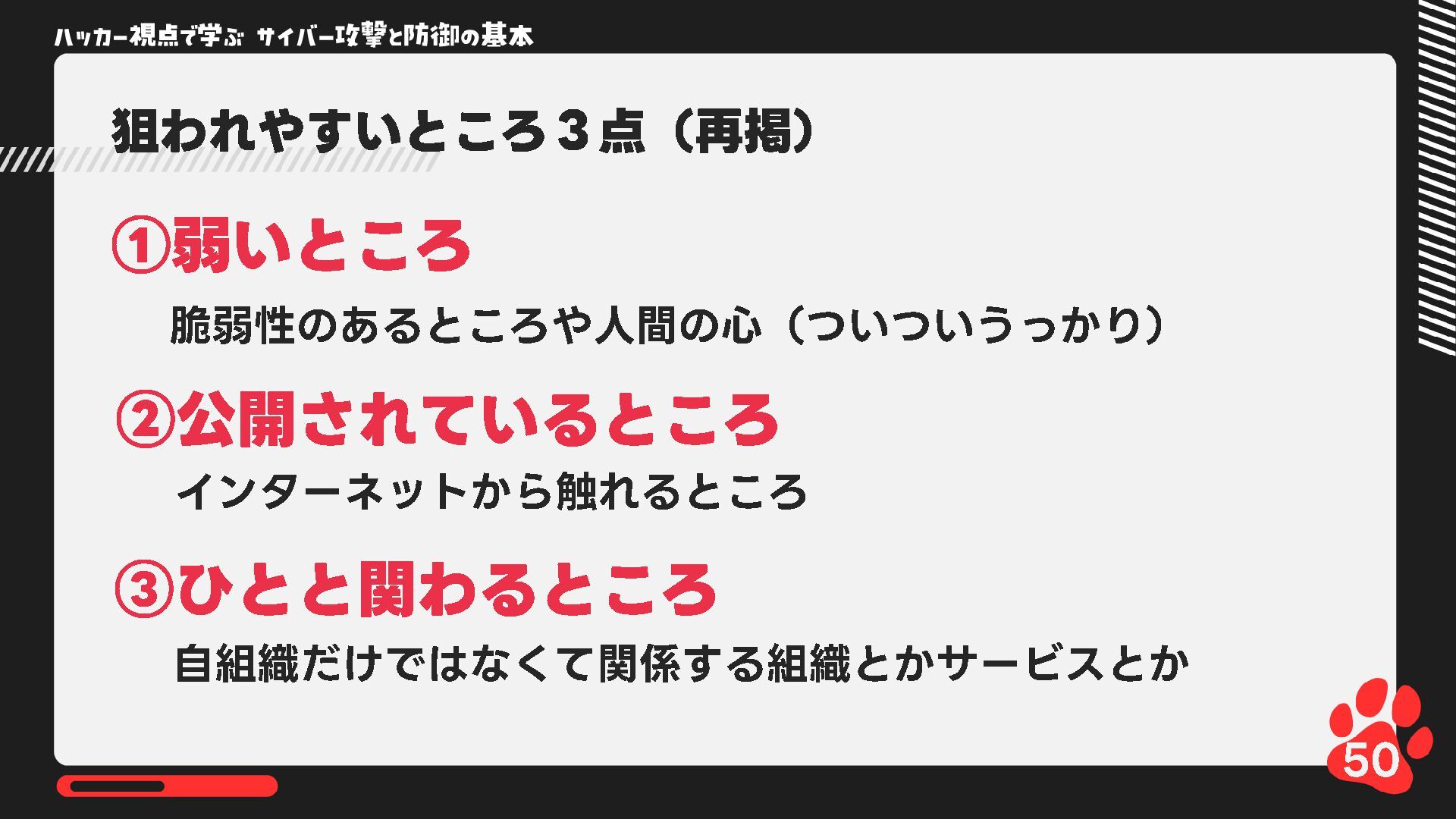 50 狙われやすいところ3点(再掲) ①弱いところ ③ひとと関わるところ ②公開されているところ 脆弱性のあるところや人間の心(ついついうっかり) インターネットから触れるところ 自組織だけではなくて関係する組織とかサービスとか