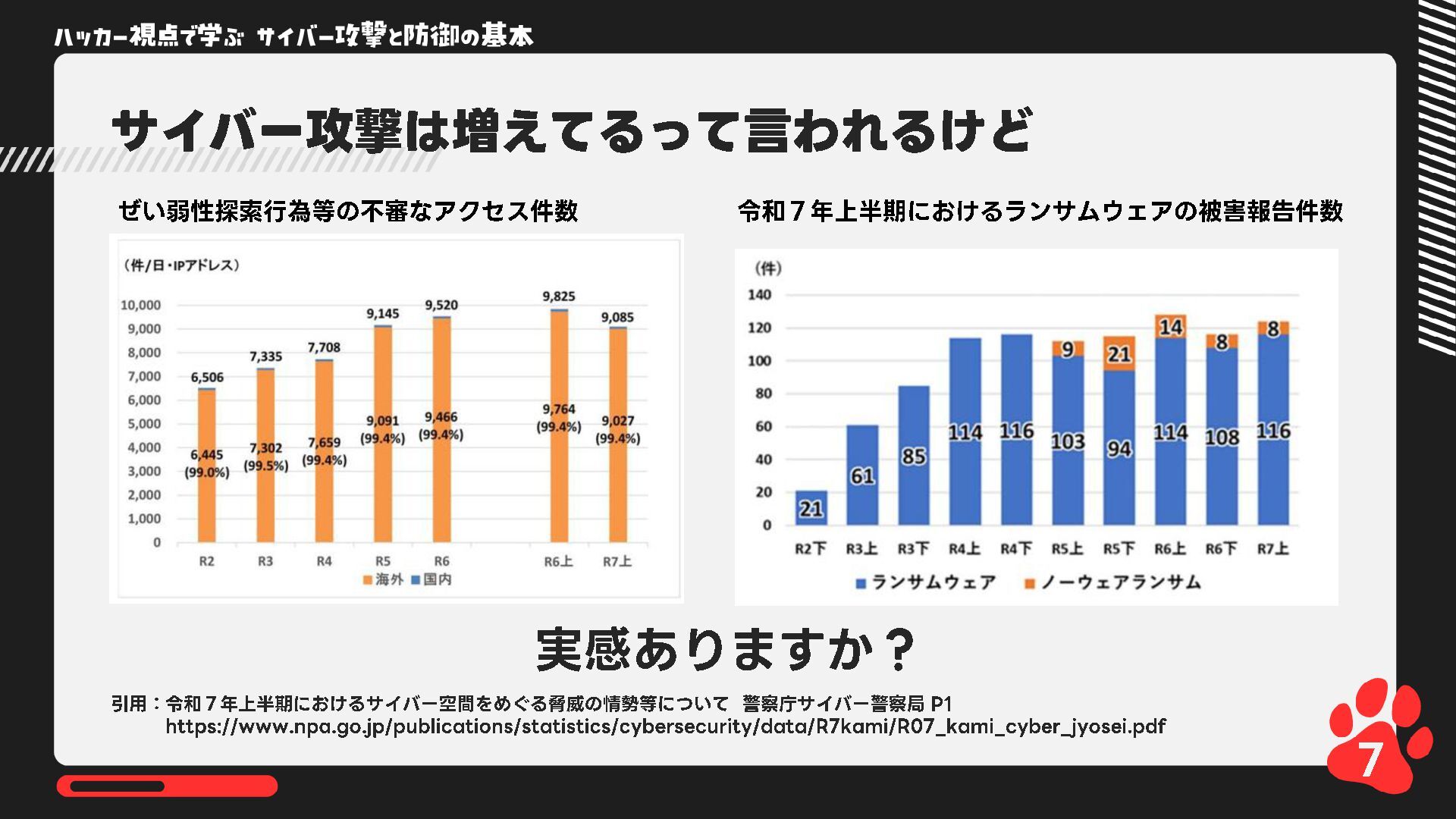 7 サイバー攻撃は増えてるって言われるけど 引用: 令和7年上半期におけるサイバー空間をめぐる脅威の情勢等について 警察庁サイバー警察局 P1 https://www.npa.go.jp/publications/statistics/cybersecurity/data/R7kami/R07_kami_cyber_jyosei.pdf 実感ありますか? ぜい弱性探索行為等の不審なアクセス件数 令和7年上半期におけるランサムウェアの被害報告件数