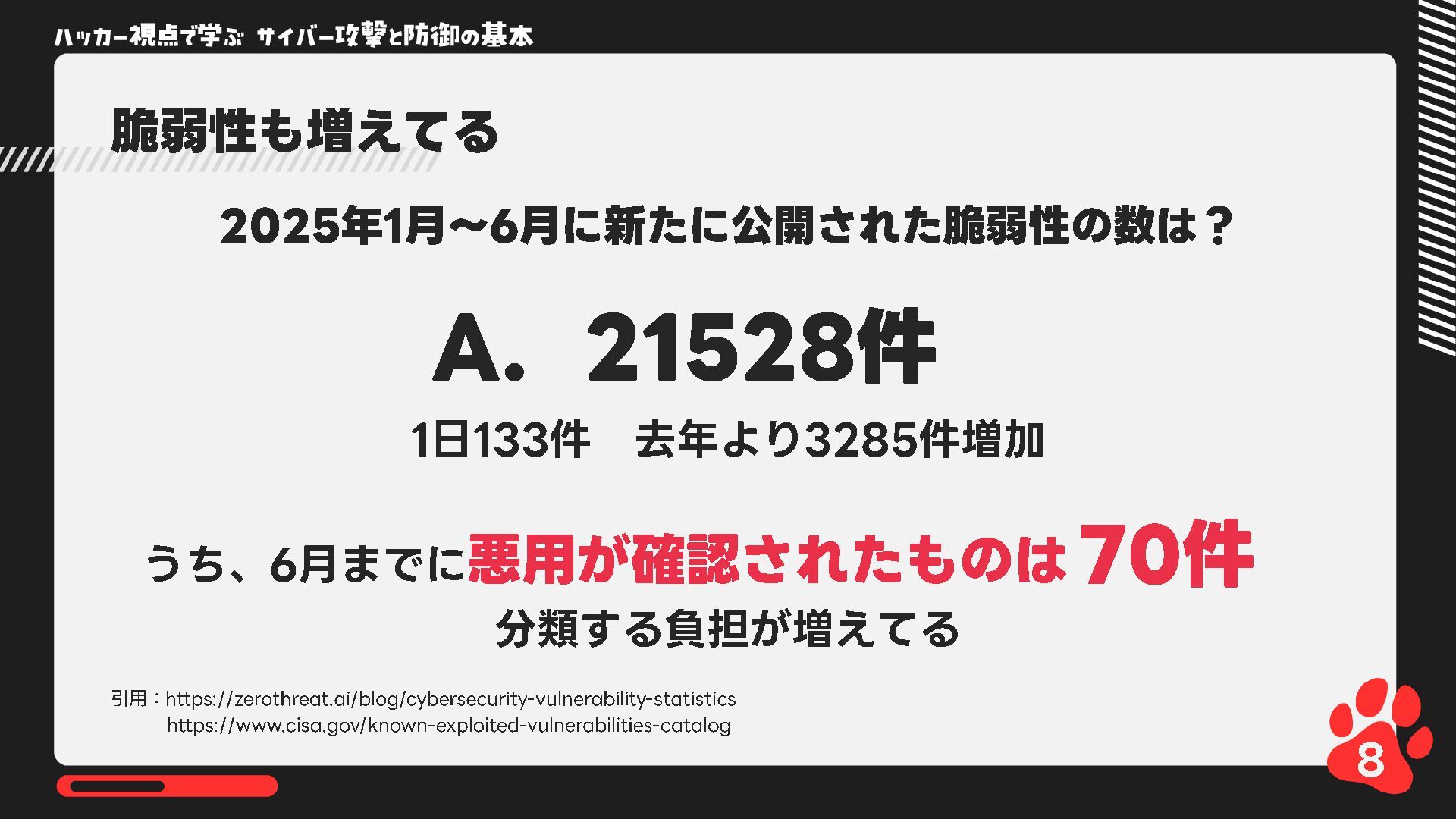 8 脆弱性も増えてる 引用: https://zerothreat.ai/blog/cybersecurity -vulnerability -statistics https://www.cisa.gov/known -exploited -vulnerabilities -catalog