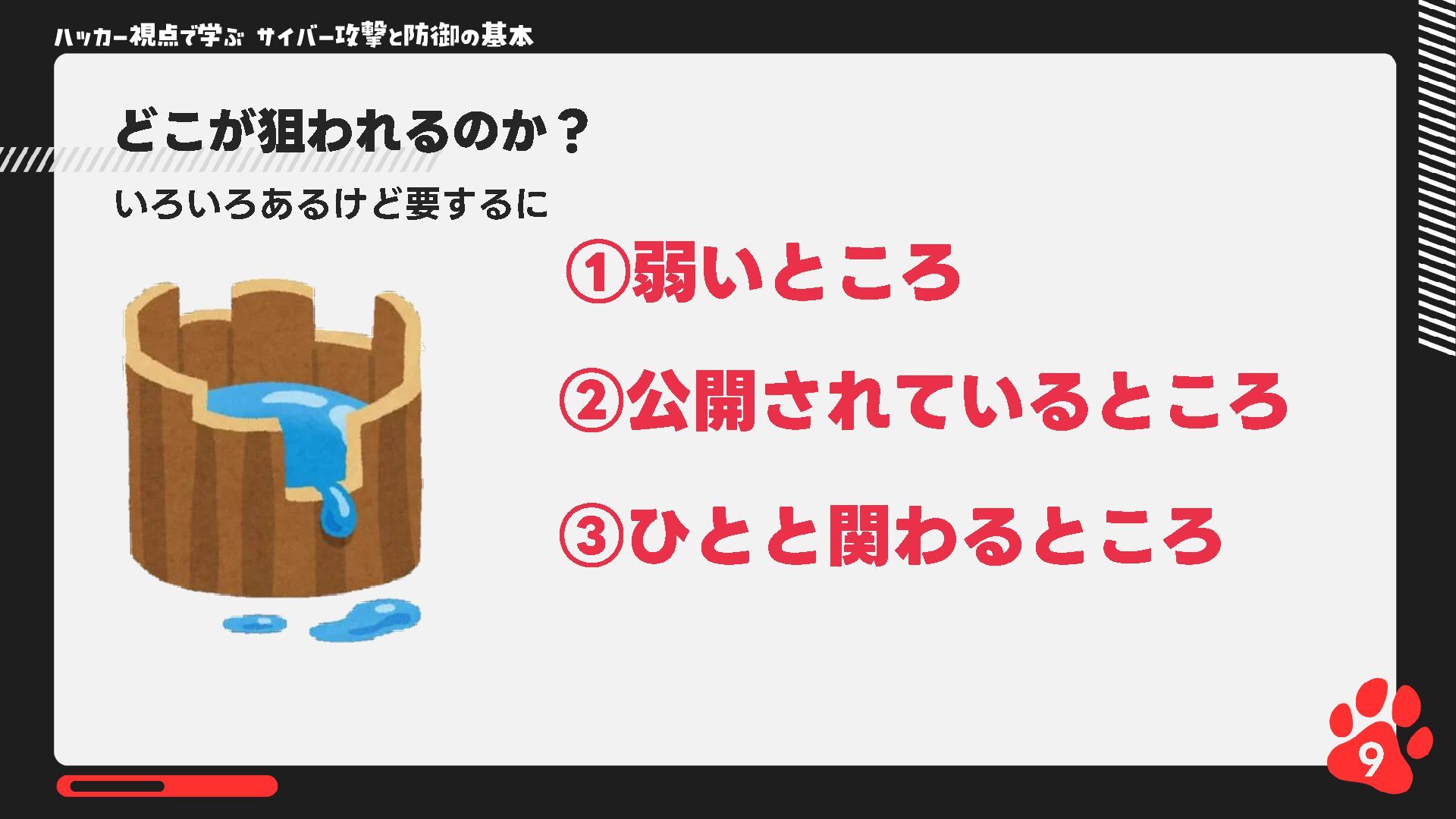 9 どこが狙われるのか? ①弱いところ ③ひとと関わるところ ②公開されているところ いろいろあるけど要するに