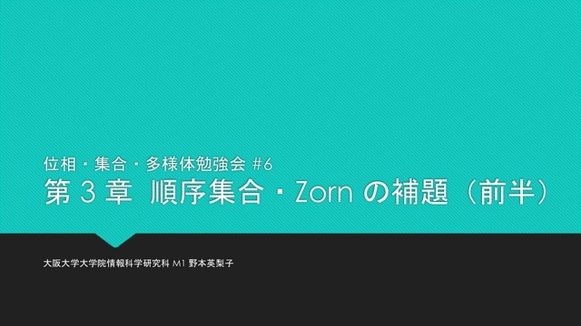 阪大の学生で開催した『位相・集合・多様体勉強会』の発表スライドです.『集合・位相入門/松坂和夫』の 3.1 節:順序集合について取り扱っています.