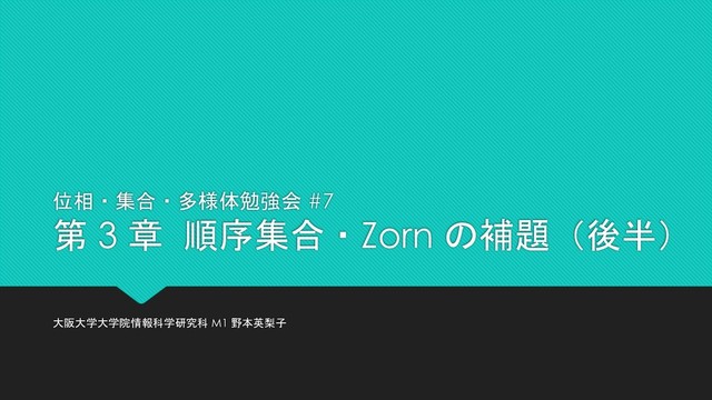 阪大の学生で開催した『位相・集合・多様体勉強会』の発表スライドです.『集合・位相入門/松坂和夫』の 3.2 節:整列集合とその比較定理と,3.3 節のしょっぱな,Zorn の補題のほんの少しだけを取り扱っています.