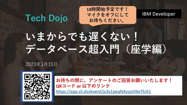 1. Tech Dojo いまからでも遅くない! データベース超入門(座学編) 2023年3月15日 IBM Developer 18時開始予定です! マイクをオフにして お待ちください。