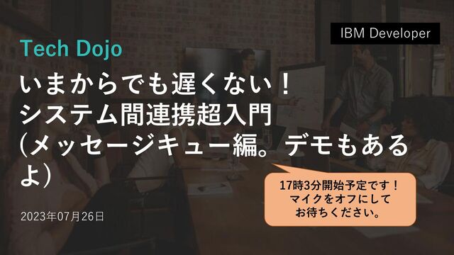 Tech Dojo いまからでも遅くない! システム間連携超入門 (メッセージキュー編。デモもある よ) 2023年07月26日 IBM Developer 17時3分開始予定です!
