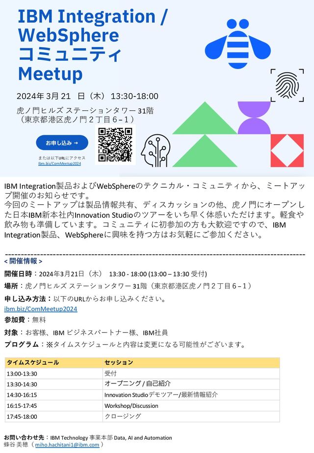> 開催⽇時:2024年3⽉21⽇(⽊) 13:30 - 18:00 (13:00 – 13:30 受付) 場所:⻁ノ⾨ヒルズ ステーションタワー 31階(東京都港区⻁ノ⾨2丁⽬6−1) 申し込み⽅法:以下のURLからお申し込みください。 ibm.biz/ComMeetup2024 参加費:無料 対象:お客様、IBM ビジネスパートナー様、IBM社員 プログラム:※タイムスケジュールと内容は変更になる可能性がございます。 お問い合わせ先:IBM Technology 事業本部 Data, AI and Automation 蜂⾕ 美穂(