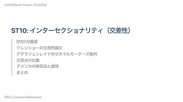 “Demarginalizing the Intersection of Race and Sex: A Black Feminist Critique of Antidiscrimination Doctrine, Feminist Theory and Antiracist Policies,” University of Chicago Legal Forum, no. 1(1989): 139-167. 単一の社会構造から差別や抑圧の要因を特定する従来の分析枠組みでは、人種や性別、 階級、性的指向、性自認、障碍など複数の構造が相互作用することで新たな抑圧が生ま れること、そしてそれに関わる問題を捉えられない。 これにより黒人女性のような複数要因による差別を被っているはずの経験や境遇はかき 消されやすく、より周縁化されたマイノリティが存在している。 クレンショーは複数の裁判事例を検討しつつ、この問題を説明するツールとして<イン ターセクショナリティ=交差性>を提案した。 ST10: インターセクショナルな視点はなぜ重要なのか? 福原正人 :