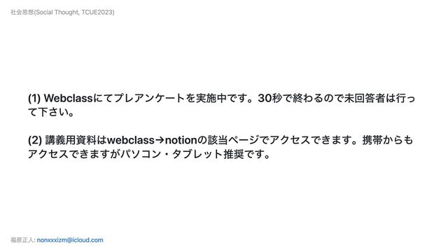 (1) Webclassにてプレアンケートを実施中です。30秒で終わるので未回答者は行っ て下さい。 (2) 講義用資料はwebclass→notionの該当ページでアクセスできます。携帯からも アクセスできますがパソコン・タブレット推奨です。 社会思想(Social Thought, TCUE2023) 福原正人: