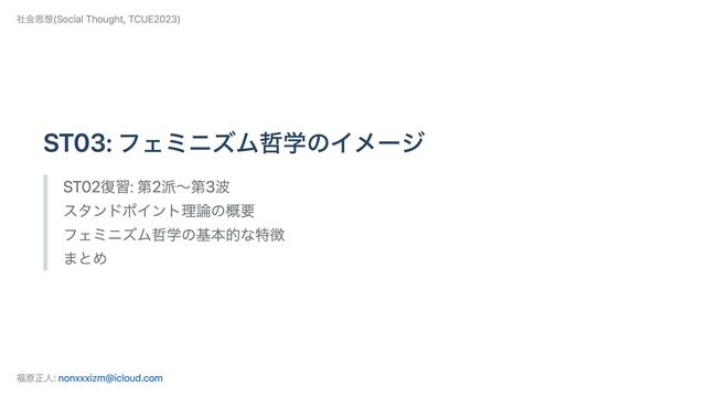 ST03: フェミニズム哲学のイメージ ST02復習: 第2派〜第3波 スタンドポイント理論の概要 フェミニズム哲学の基本的な特徴 まとめ 社会思想(Social Thought, TCUE2023)