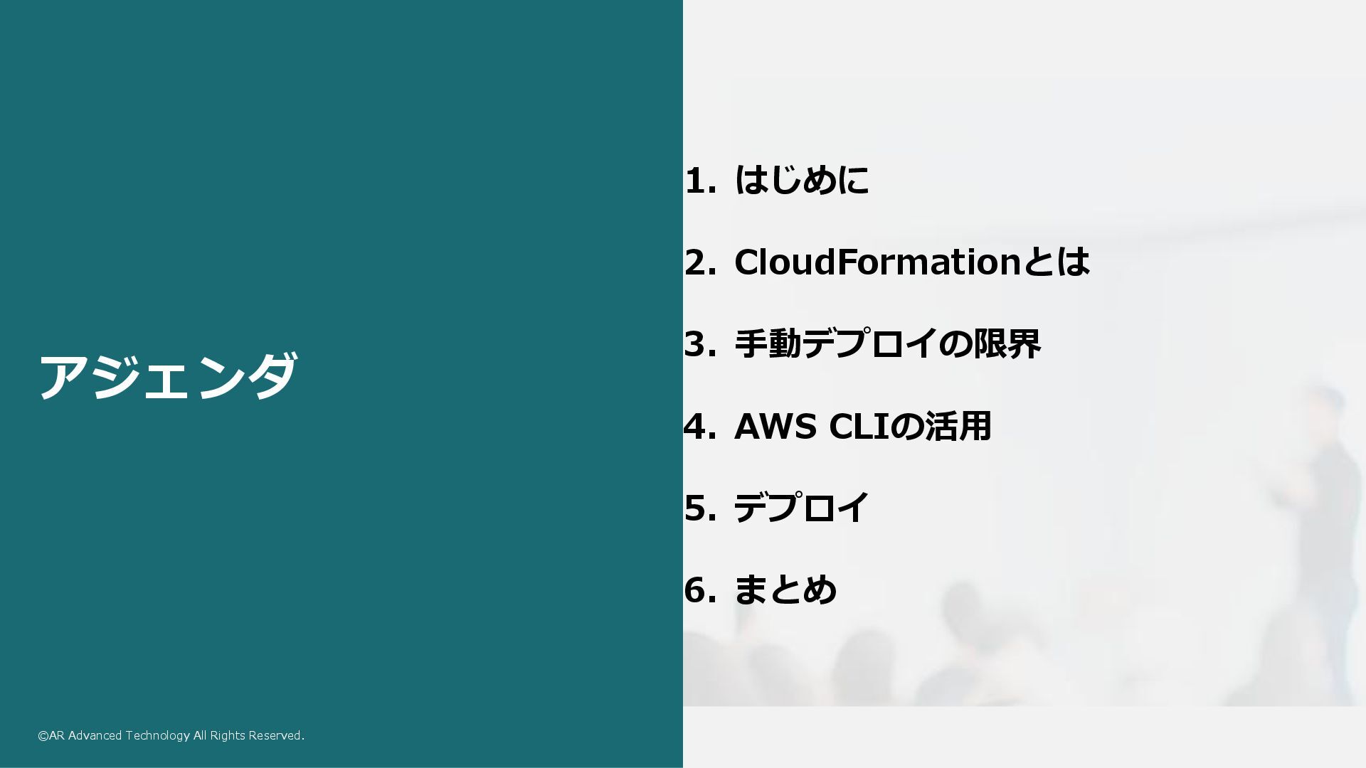 CloudFormationとは 3. 手動デプロイの限界 4. AWS CLIの活用 5. デプロイ 6. まとめ アジェンダ