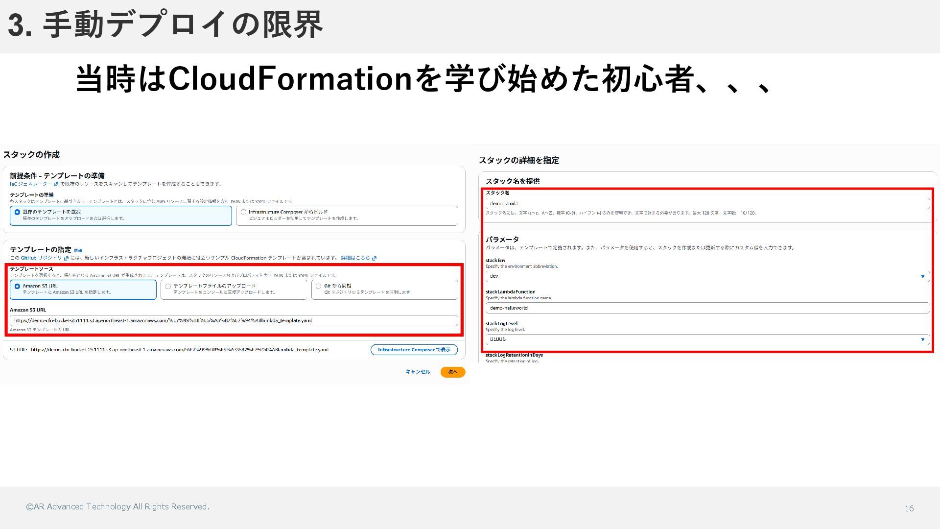 16 ©AR Advanced Technology All Rights Reserved. 3. 手動デプロイの限界 当時はCloudFormationを学び始めた初心者、、、