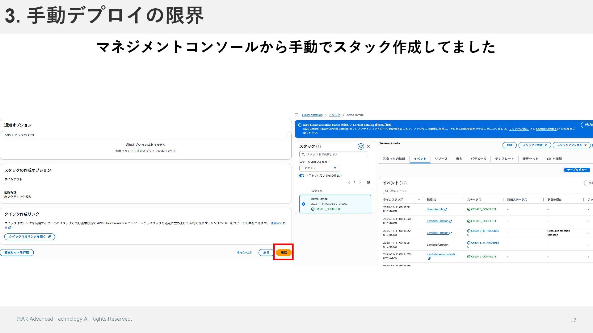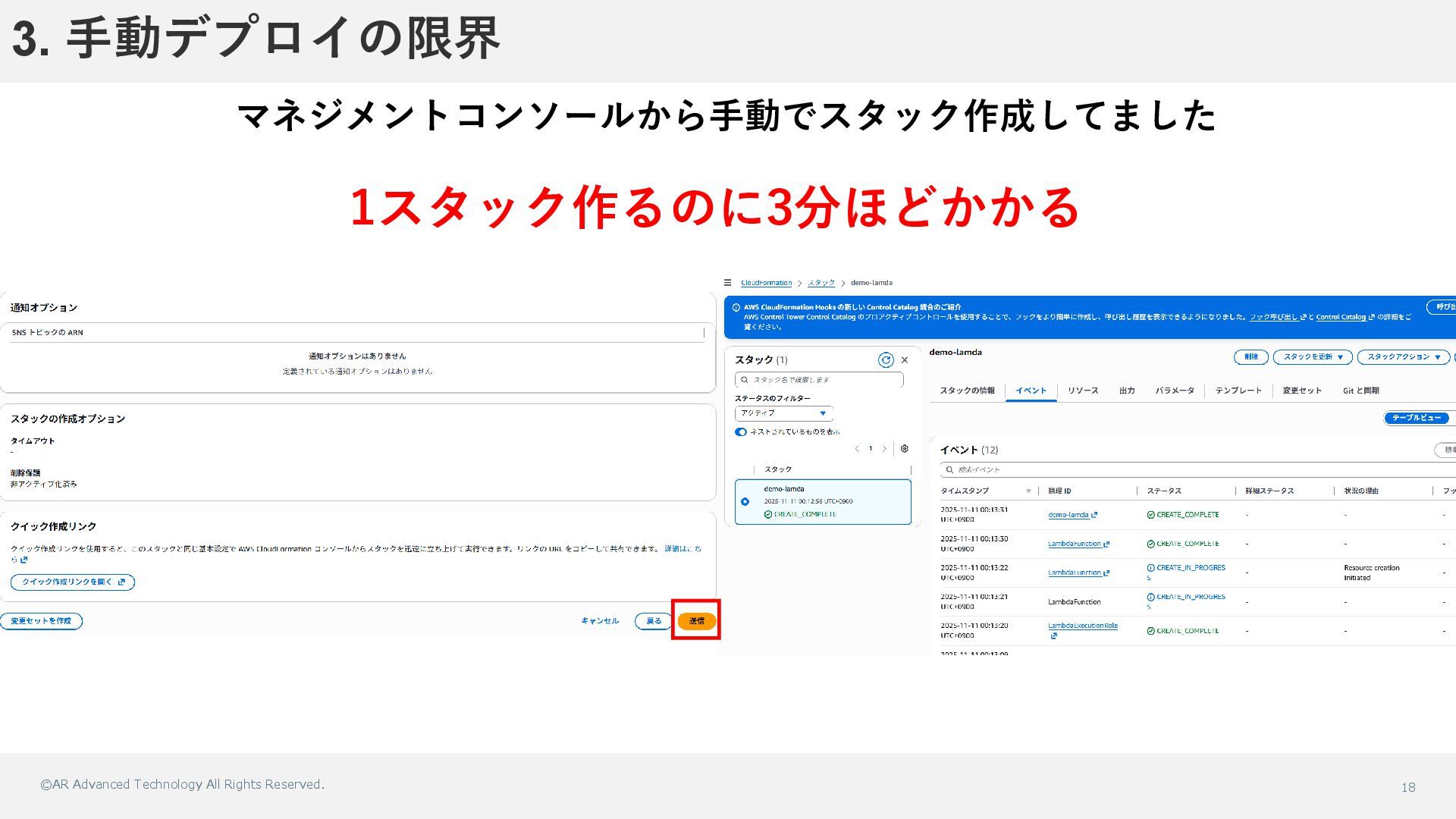 17 ©AR Advanced Technology All Rights Reserved. 3. 手動デプロイの限界 マネジメントコンソールから手動でスタック作成してました