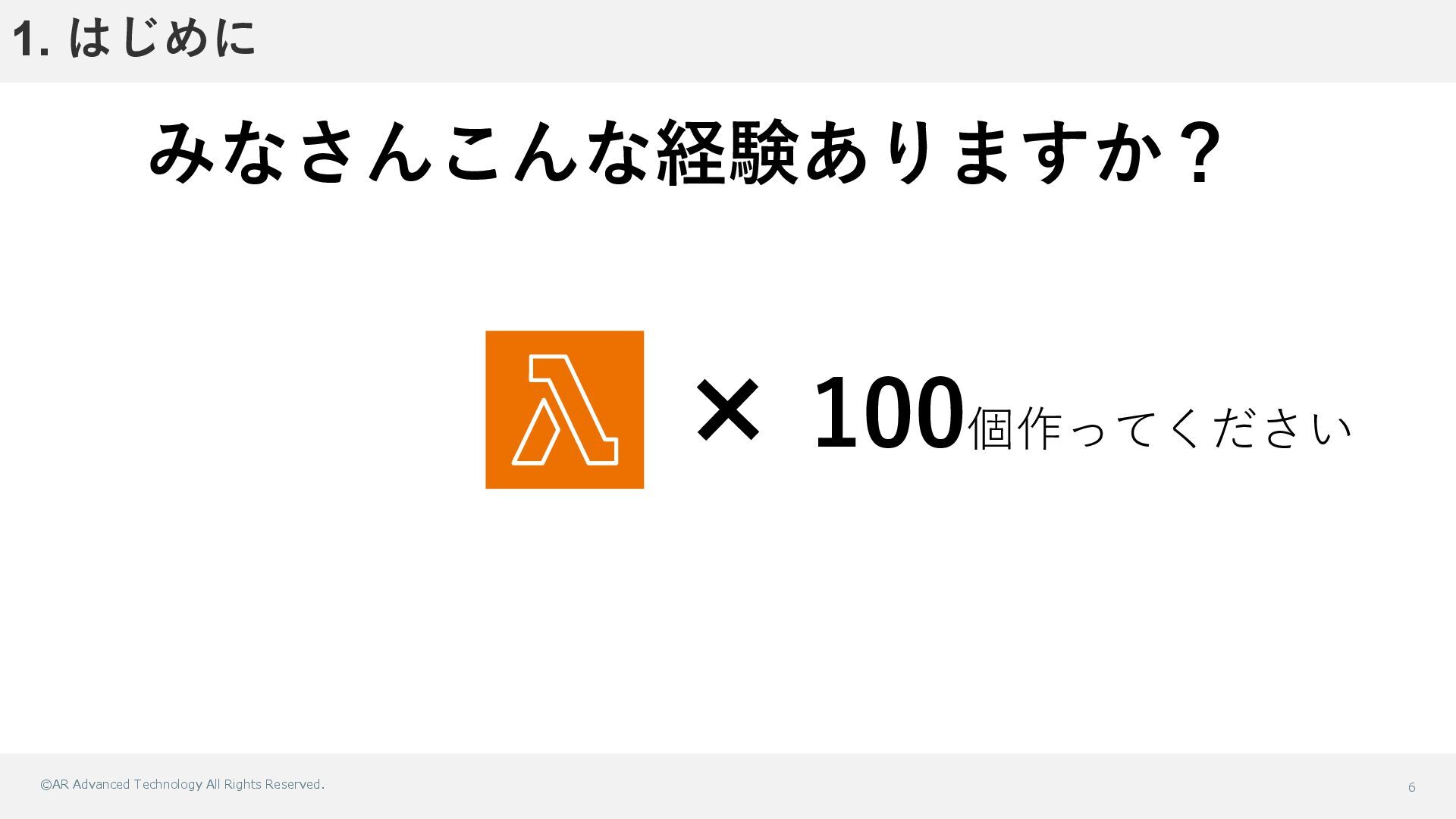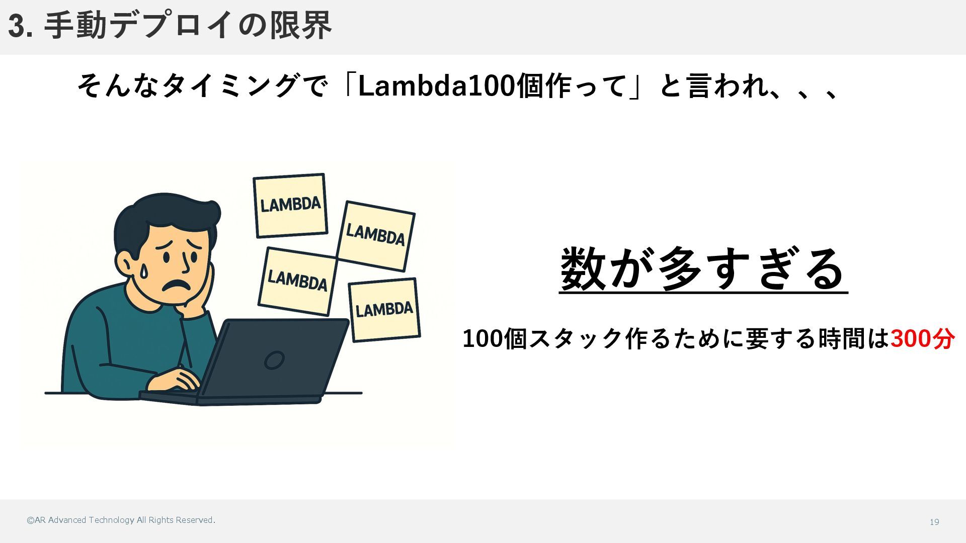 19 ©AR Advanced Technology All Rights Reserved. 3. 手動デプロイの限界 そんなタイミングで「Lambda100個作って」と言われ、、、