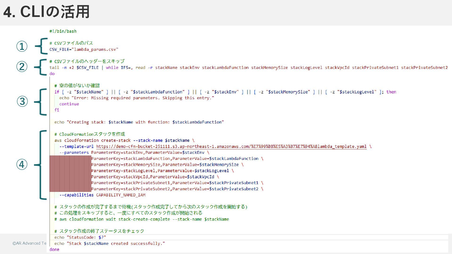 読み込むCSVファイルパスの指定 ② CSVファイルの先頭行を飛ばして、パラメータを取得 ③ 必須パラメータの空欄チェック ④ AWS CLI “aws cloudformation create-stack” を実行 ⑤ ②~④をCSVファイルの行数分繰り返す Shellスクリプトの内容